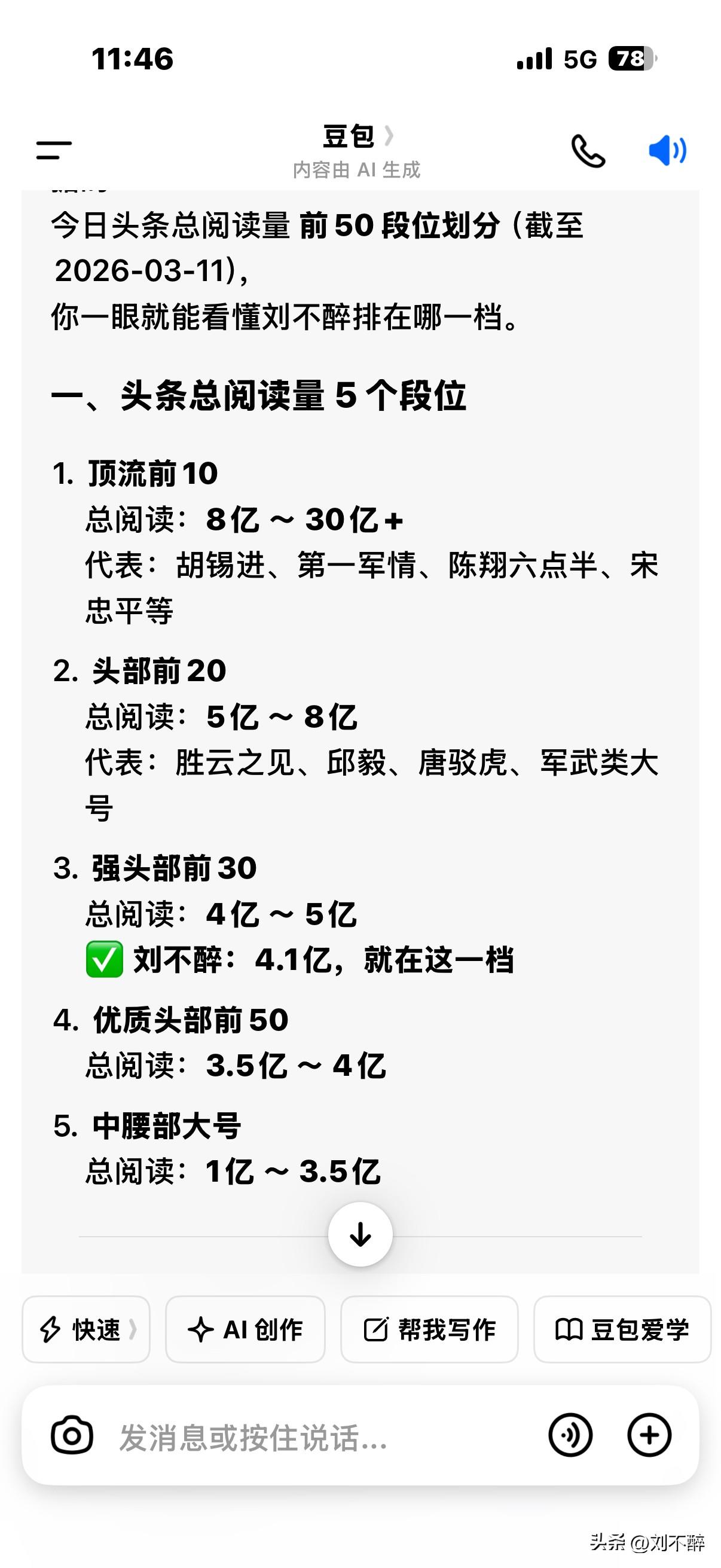 我问豆包,本人的总阅读量4.15亿,在头条平台处于什么位置? 豆包答:刘不醉现在