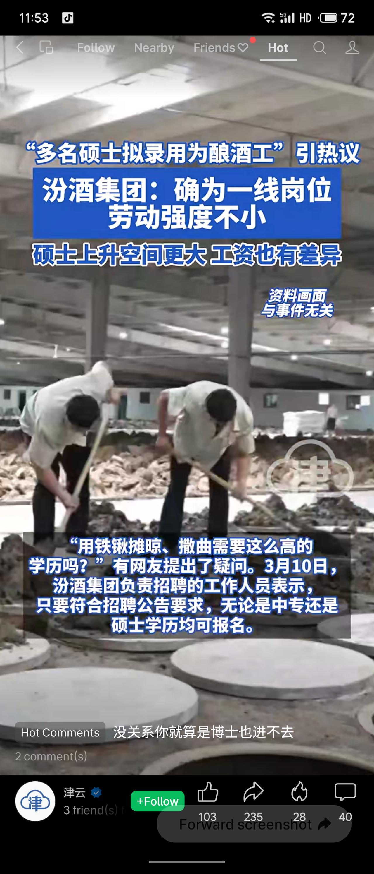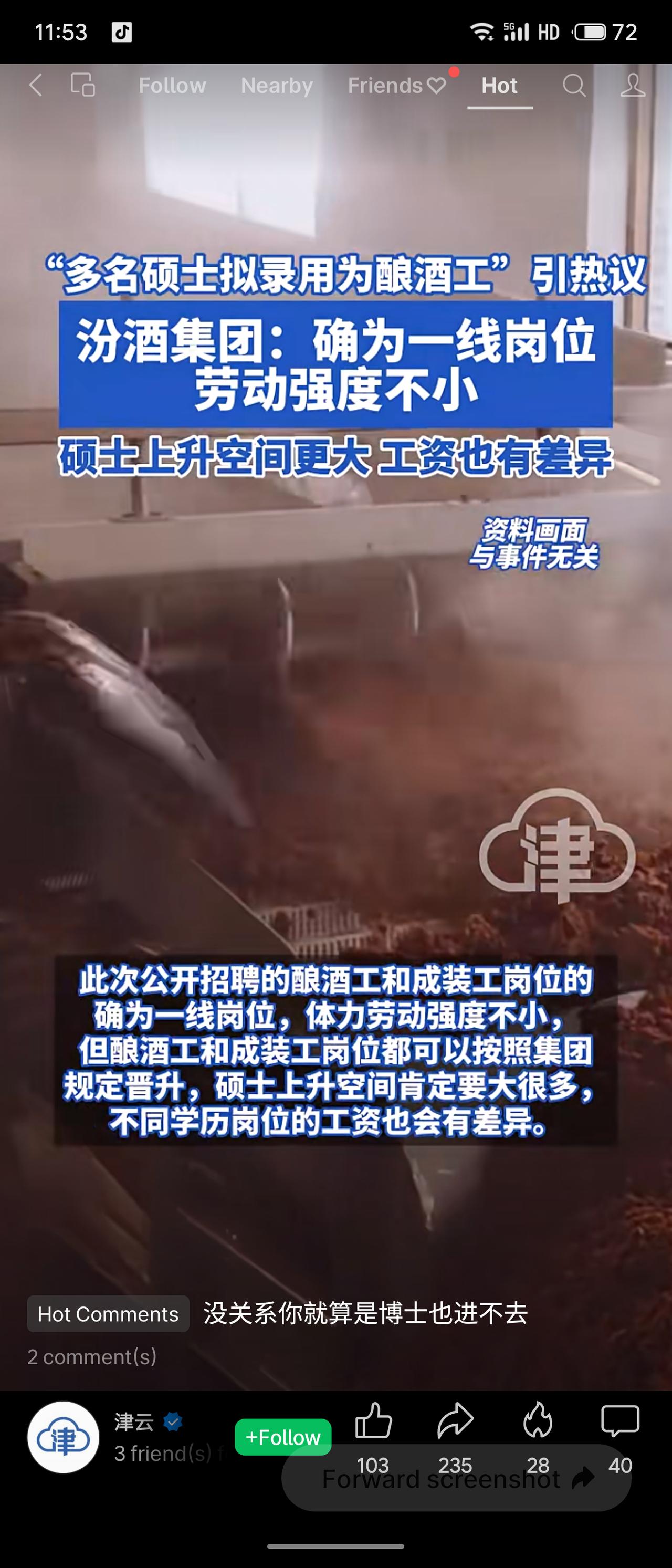 汾酒集团近日公示的生产一线招聘中,十余名硕士拟任酿酒工、成装工,引发热议。公司回应称该岗位确为一线且劳动强度大,但硕士上升空间与薪资更有优势。这一现象折射出当前高学历人才择业更趋务实,传统制造业吸引力提升,也反映出企业对高素质技能型人才的重视与储备意图。