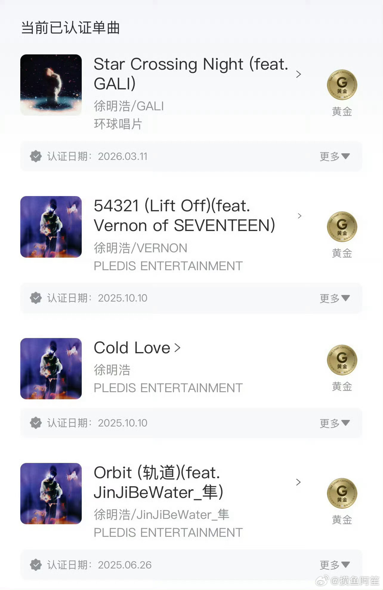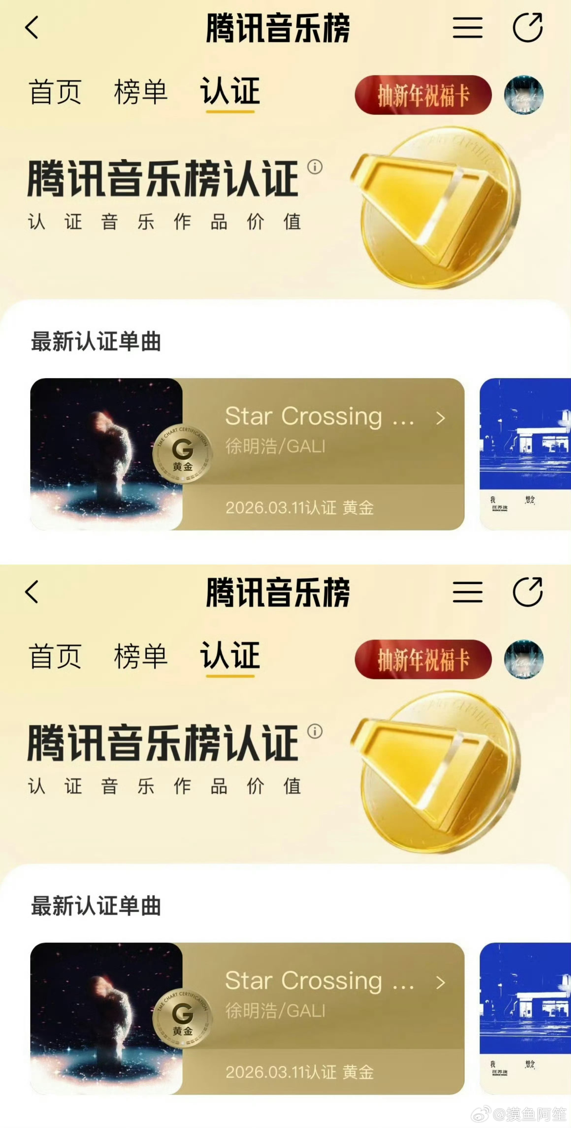 徐明浩《Star Crossing Night》获得Q音黄金单曲认证!恭喜🎉就