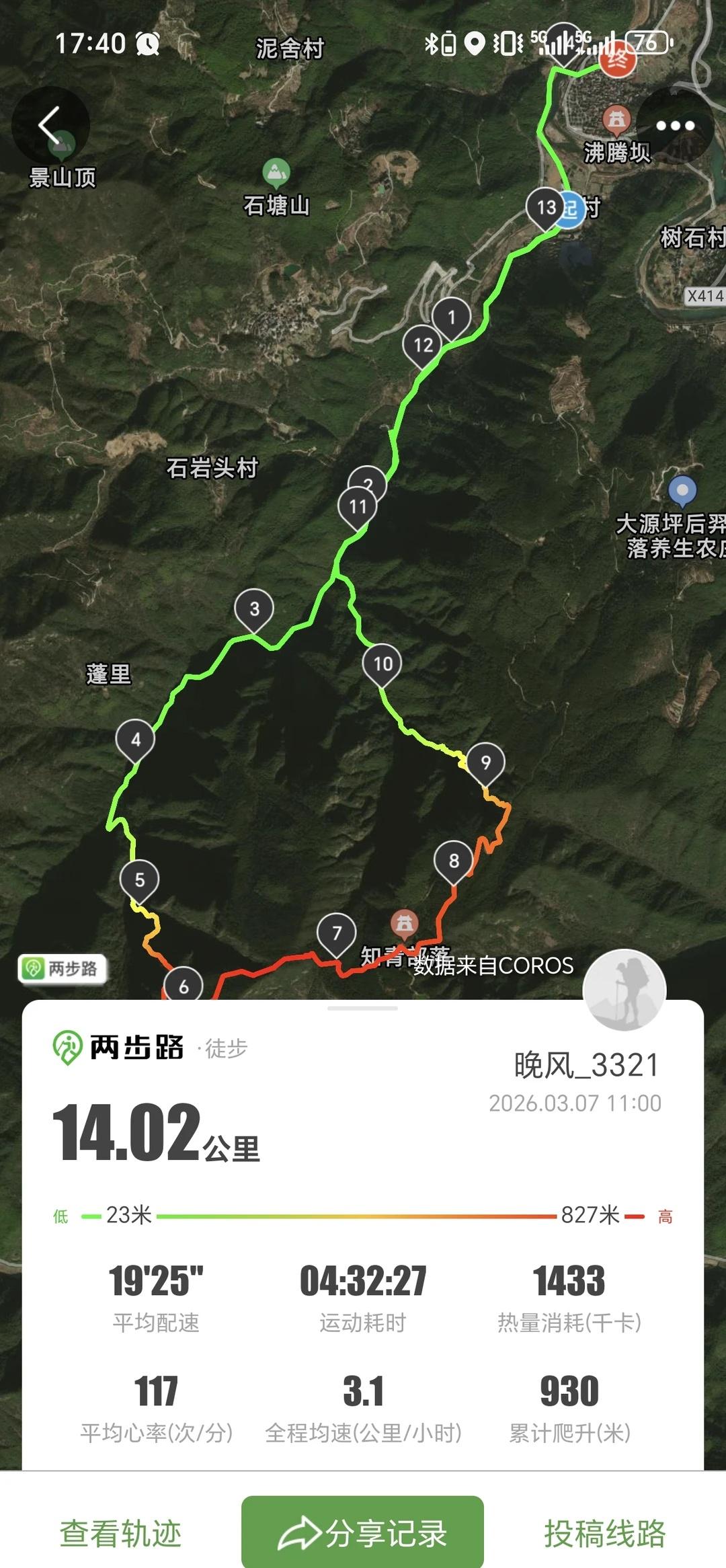 富阳横坑0307徒步 总结:线路非常有趣味性,风景不错,非常值得一去,有石海攀爬,陡坡四驱攀爬,瀑布群 线路概况:前面2公里为公路和机耕道缓坡,到4公里为石板路+土路古道沿小溪缓慢上升,会多次通过石墩子穿过小溪,到5公里为先台阶路后土路上山,到5.5公里为石海攀爬结束后四驱野攀陡坡,有一定危险性,攀爬结束后基本到顶,到7.5公里为土路,基本比较平缓,到接近9公里为机耕路下坡然后特别注意要左转下山,到接近11公里主要为台阶路下山,后面与来的路重合 补给情况:轨迹终点处有补给,有面条年糕,有卫生间,路线全程无补给, 线路难度:约14公里900米爬升,难度比较大,体力较差着请谨慎,攀爬有几次有一定危险,小白勿入 徒步丈量世界 徒步圈
