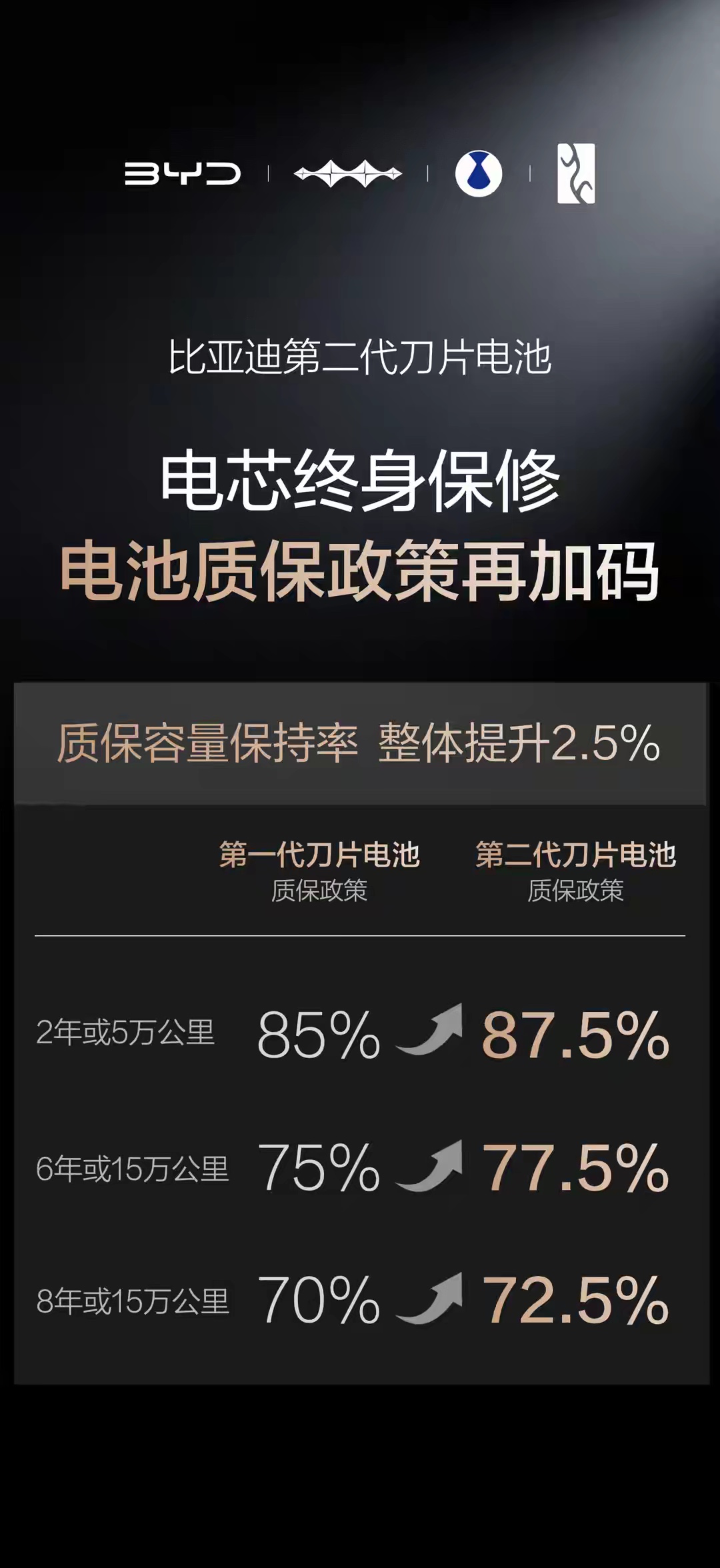 比亚迪的闪充技术速度快,有消费者担心会不会影响电池的寿命呢?比亚迪给出的答案是肯定不会。第二代刀片电池的闪充既充电快还耐用,对电池寿命没有影响。在质保上,电池“容量保持率”提升2.5%,电池容量低于77.5%就免费包换,电芯还是终身质保。