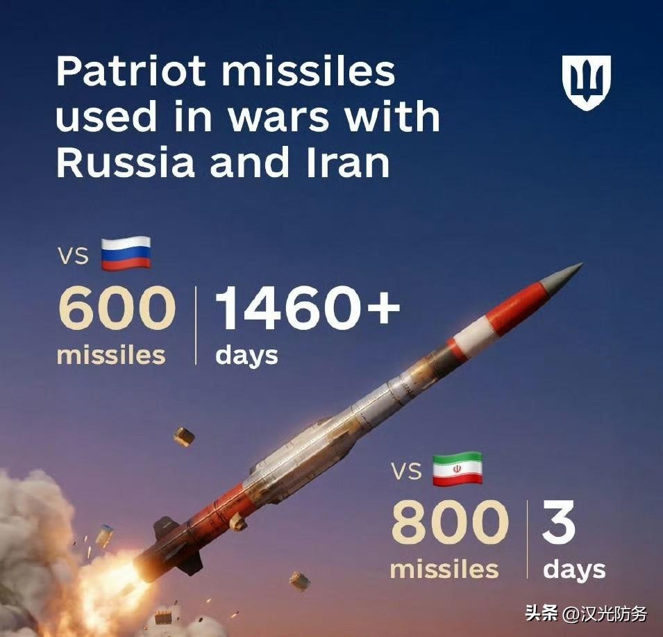 乌克兰国防部分享了以下信息: 在乌克兰对抗俄罗斯的超过1460天里,“爱国者”防空系统共发射了约600枚防空导弹;而在对抗伊朗的短短三天内,就发射了约800枚防空导弹。