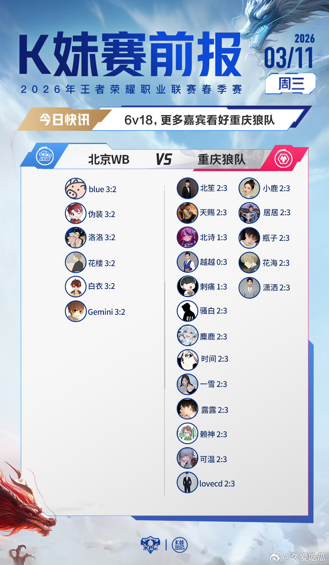 2026KPL春季赛|K妹赛前报17v7,更多嘉宾看好北京JDG;6v18,更多
