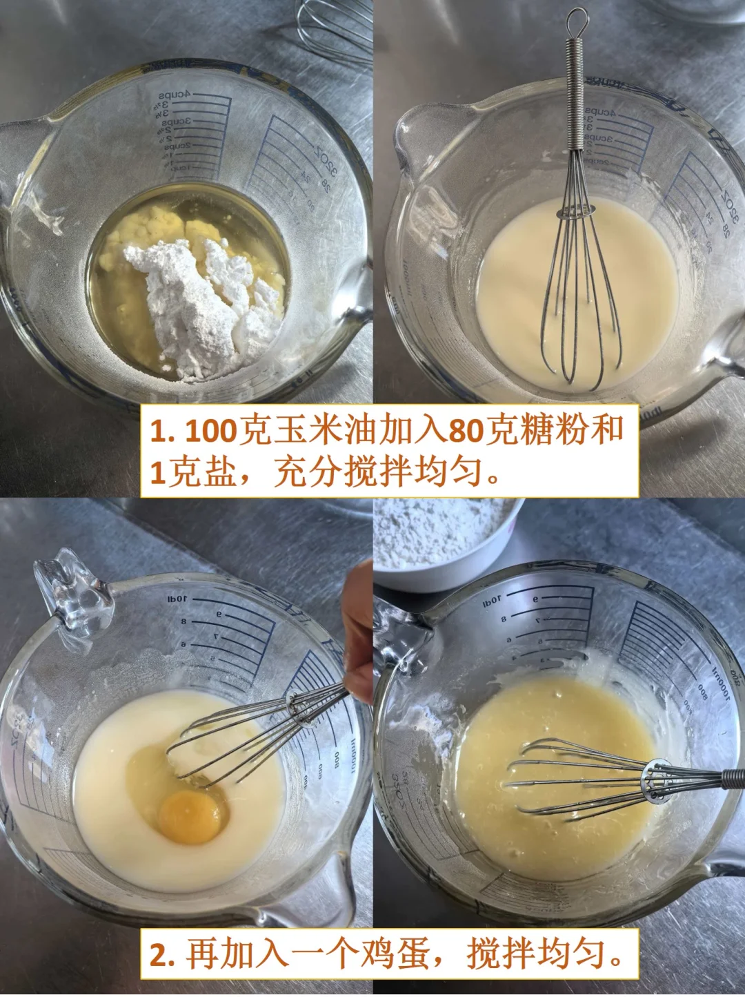 1. 100克玉米油加入80克糖粉和1克盐,充分搅拌均匀。