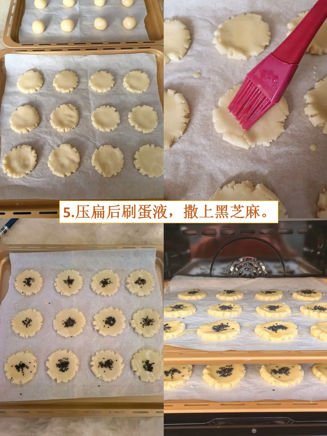 5. 压扁后刷蛋液,撒上黑芝麻。