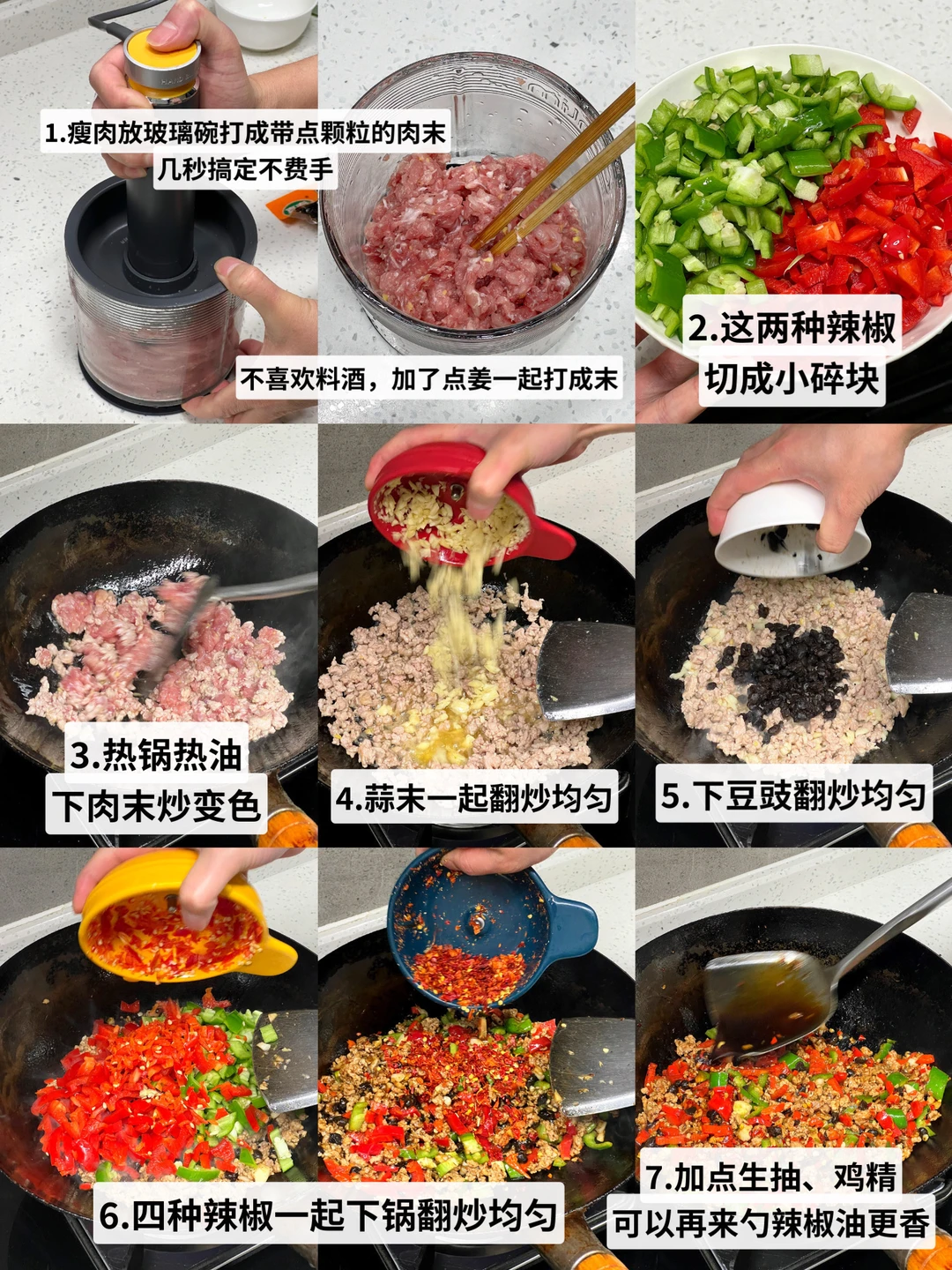 今天男朋友做的这个菜太香太下饭了 用来拌面、夹馒头吃也嘎嘎好吃 📝食材准备 瘦肉用佐料机打成带颗粒感的肉末 辣椒准备了四种,青椒、红椒切小块,小米椒和干辣椒打成碎 还有少不了的蒜末、豆豉 具体做法Mark图上啦,很简单,大家放心冲[喝奶茶R]!可以一次多做点,做好马上放冰箱冷藏,三五天都不会坏。想要存更久的话,直接冷冻起来就行。