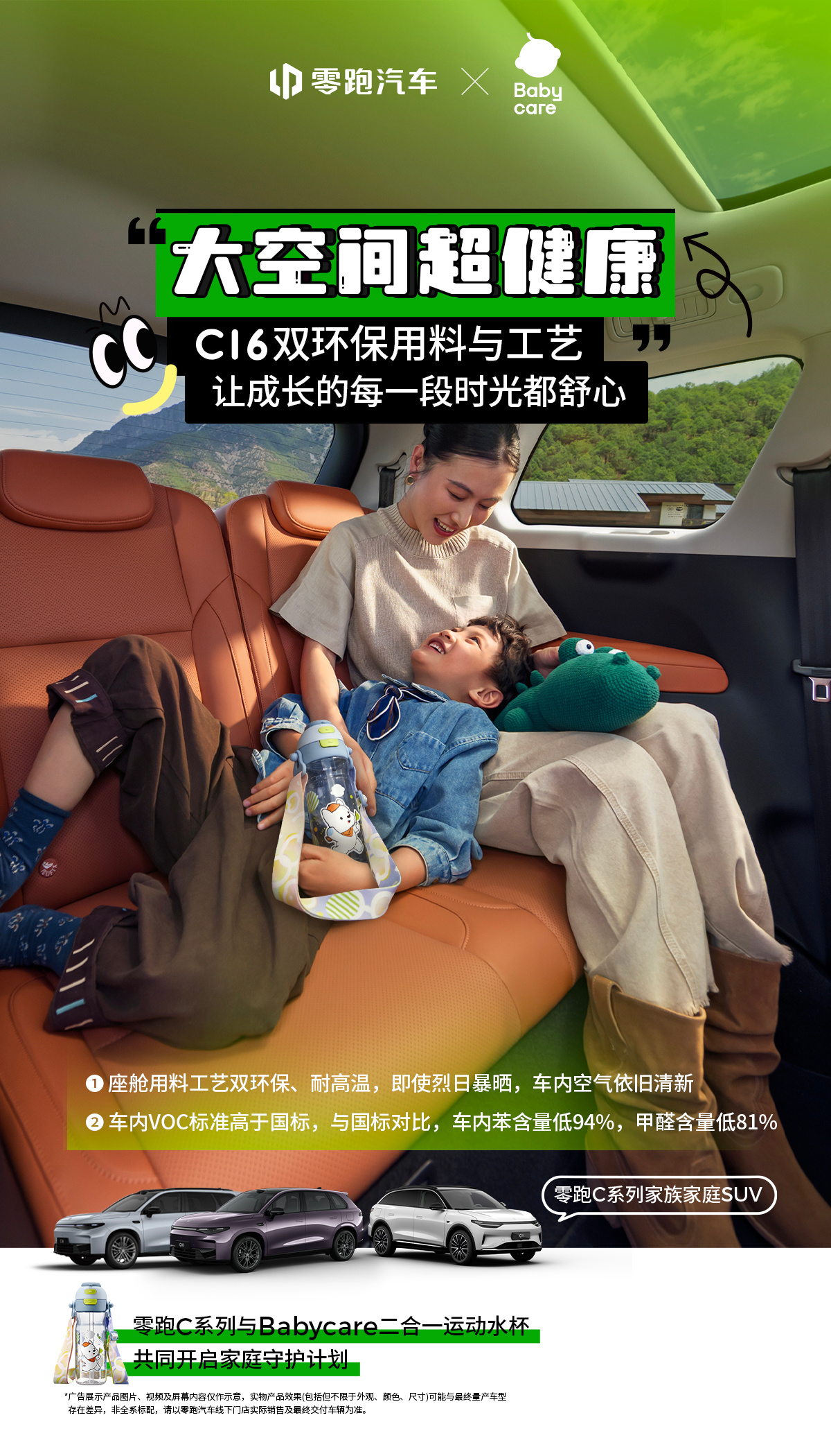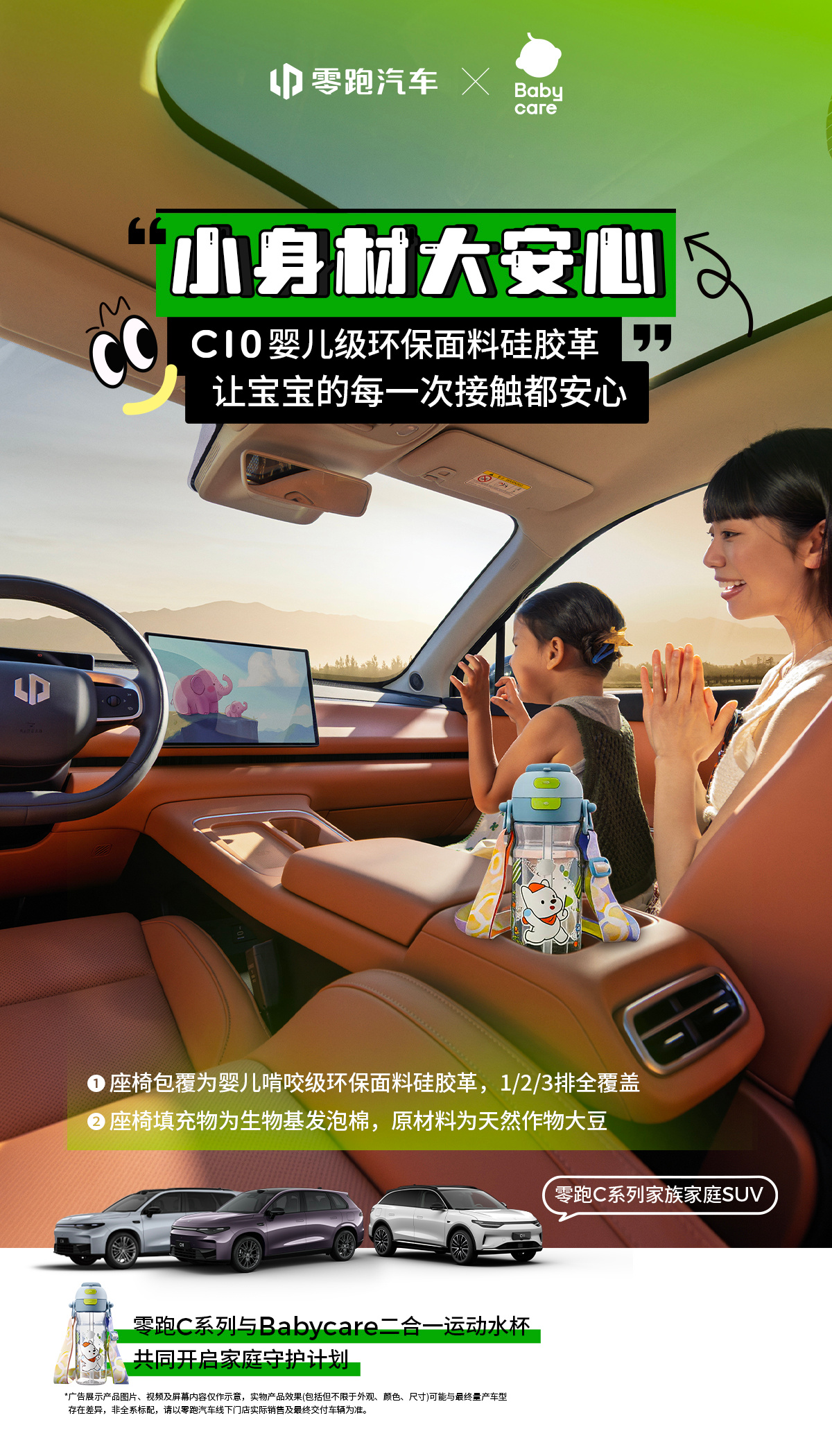 从宝宝第一次抓握,到每一次安心熟睡零跑C系列,用婴儿级环保面料打造移动安全屋座舱用料工艺双环保,烈日暴晒,车内空气依旧清新81.9%高强度笼式车身,守护全家出行每一程零跑汽车与共同开启家庭守护计划装下童年,carry安心,让爱与安全一路随行 🚗零跑C系安心守护计划零跑C10零跑C11零跑C16Babycare二合一运动水杯