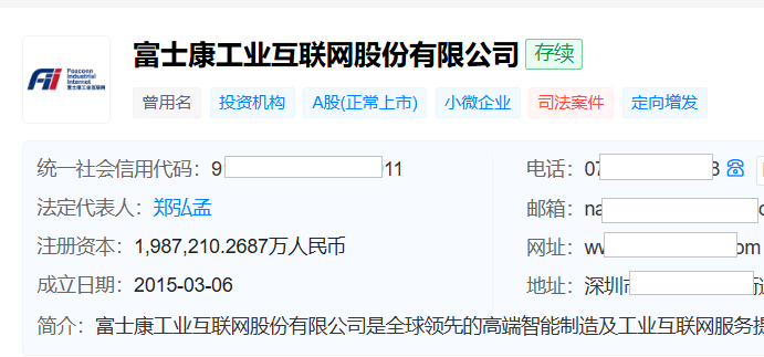 天眼查显示,工业富联成立于2015年3月,公司注册地位于广东省深圳市,2018年6月在上交所主板上市。年报称其是“全球领先的高端智能制造及工业互联网解决方案服务商”,核心业务涵盖云计算、通信及移动网络设备、工业互联网三大板块,依托先进制造与系统整合能力,成为“全球AI算力产业链核心供应商”。