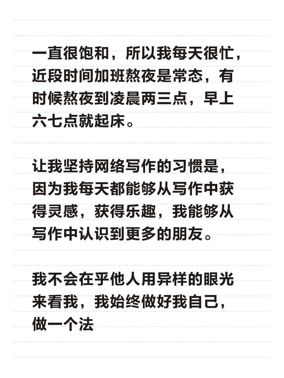 我写作的动力在于我已经将网络创作当成了习惯,当成了动力,不管多忙,我都会记录自己的生活感悟和学习、工作心得。