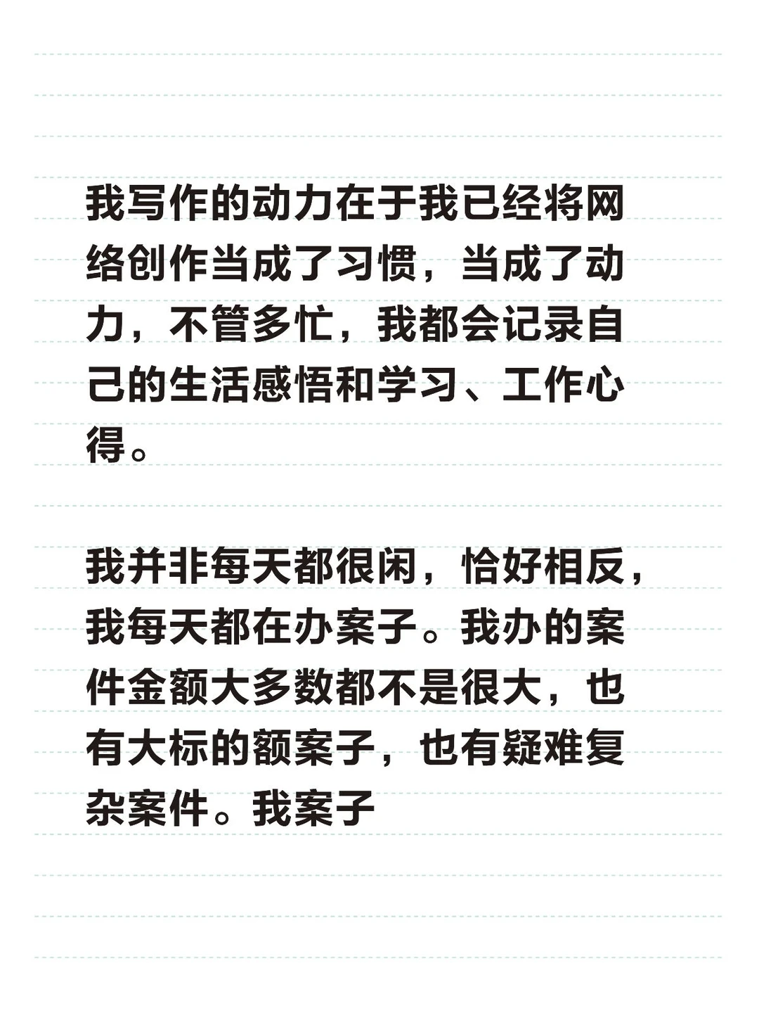 我并非每天都很闲,恰好相反,我每天都在办案子。我办的案件金额大多数都不是很大,也有大标的额案子,也有疑难复杂案件。我案子一直很饱和,所以我每天很忙,近段时间加班熬夜是常态,有时候熬夜到凌晨两三点,早上六七点就起床。