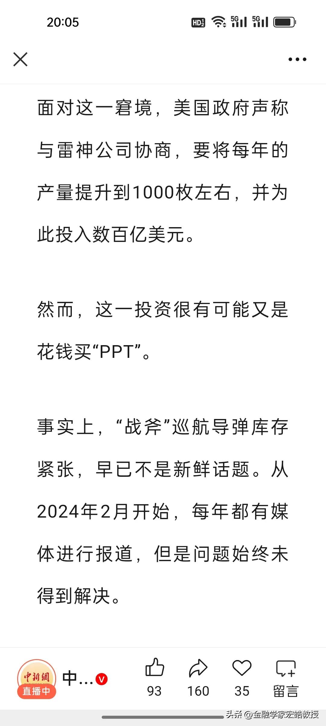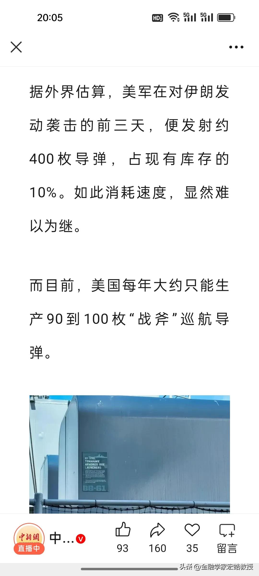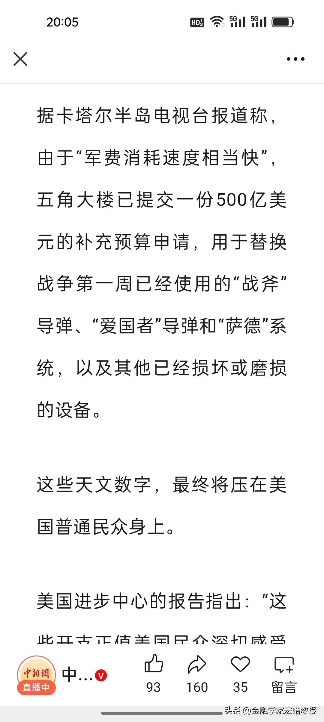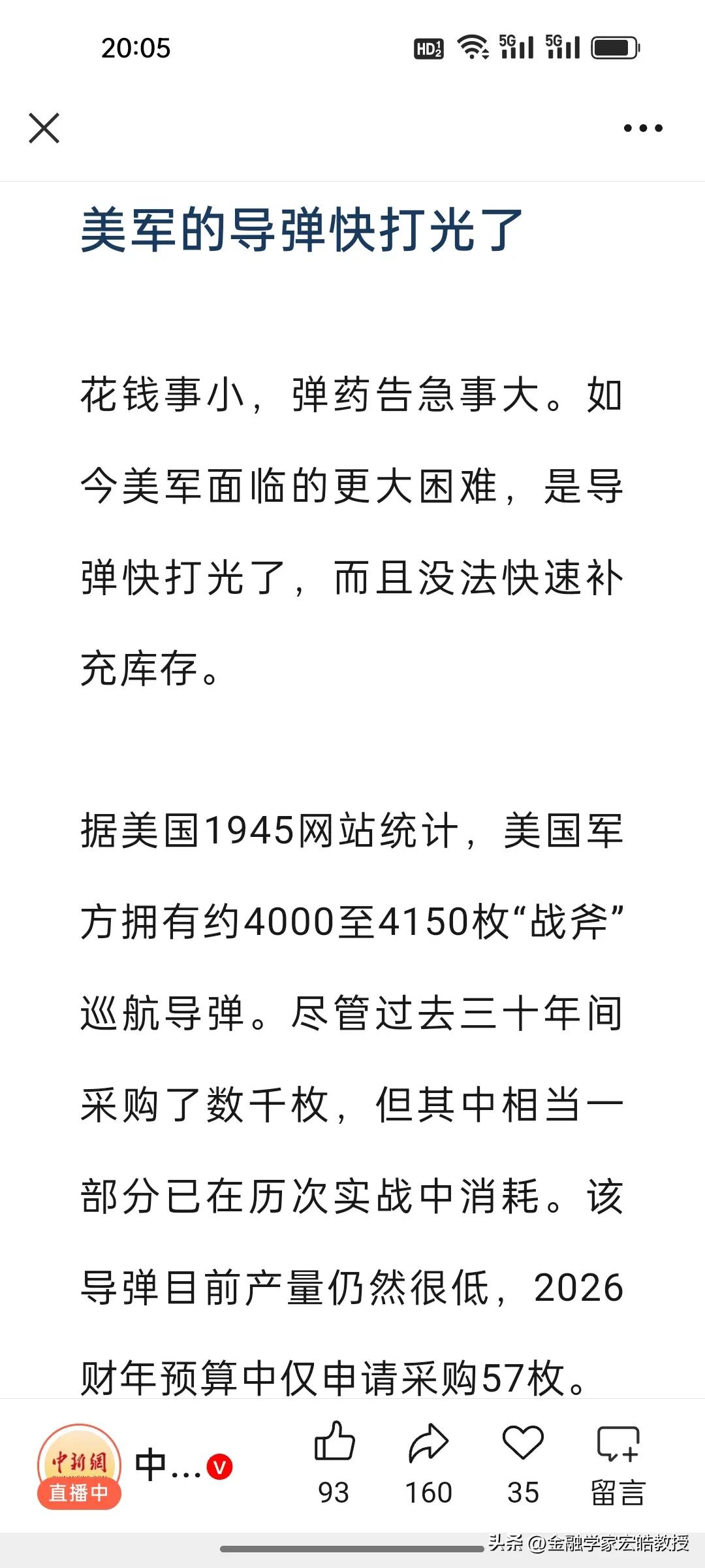 刚刚看到《中国新闻网》一篇文章,帮美国算了一笔账,目前,美国打伊朗导弹快打光了,且每周烧光50亿美元!纳税人的心都在滴血啊! 美国对伊朗动手第一周,账面直接亮红灯!美军“战斧”巡航导弹库存告急,三天打光400枚,占总库存10%,而年产能仅90-100枚,根本补不上,现在竟然向乌克兰请求支援协助打无人机,可见美国多么多么捉襟见肘,让曾经的支援对象来“反哺”! 更扎心的是美伊战争的烧钱速度:这场冲突日均耗资8.9亿美元,一周狂吞50亿美纳税人的钱,F-15被击落一架就亏1亿,五角大楼紧急申请500亿补充预算,窟窿越填越大。本来特朗普还想各种政策来化债,没想到这仗一打,这下美债是永远还不清了。 美国看似强势的军事行动,美国驻华大使馆天天发捷报,实则是寅吃卯粮。当军费账单摊开,普通美国人的医保、住房都要为这场冲突买单,美国这场“无妄之战”,终究是打不动也耗不起!