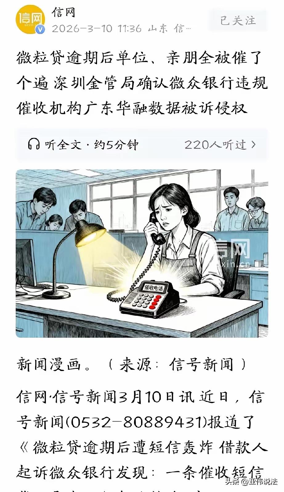广东深圳,女子着急用钱,就连续在微粒贷上借了两笔,分别是4万元和2.5万元。可事后没能按时还款,竟收到了平台的短信轰炸,最多的一天有十几条,就连单位同事和亲朋好友都被催了个遍。女子被折磨得受不了,一纸诉状告上法庭。经过法院深入调查,这才发现,给她发短信的竟然有6家公司,更可怕的是,仅其中一家公司,就将自己的个人信息转卖了7遍,这让女子后怕不已。 这起事件看似只是一个普通的借贷纠纷,却暴露出当前个人信息保护的巨大漏洞和金融借贷行业的灰色地带。我们不禁要问:当借款人还款困难时,催收手段为何会变得如此粗暴,甚至波及无辜的亲友?为什么一个人的信息会被多次转手,变成了“商品”在资本市场上反复交易? 这背后,反映的是一个更深层次的问题——金融科技的快速发展,带来了便利的同时,也让个人信息安全成为了最脆弱的环节。微粒贷等互联网小额贷款平台,虽然极大地满足了许多急需用钱人的需求,但其背后的催收机制和信息管理却缺乏足够的监管和透明度。平台为了降低风险,将借款人的信息出售给第三方催收公司,形成了一条庞大的信息“黑市”,消费者的隐私权和人格尊严被无情践踏。 更让人心寒的是,这些催收公司为了收回债务,甚至不惜采取骚扰亲友、单位同事的方式,给借款者带来巨大的精神压力和社交困扰。试想,一个普通的上班族,因为一时的经济困难,不仅要面对经济压力,还要承受来自四面八方的短信轰炸和电话骚扰,这样的生活质量还能有保障吗?这不禁让人质疑:我们的社会是否真正为弱势群体提供了足够的保护? 法院的介入虽然为该女子讨回了一些公道,但这绝非个案,而是整个行业亟待改革的缩影。监管部门需要出台更严苛的法规,规范借贷平台和催收行为,严厉打击个人信息非法买卖和滥用。同时,我们每个人也应提高警惕,保护好自己的信息安全,不盲目借贷,理性消费。 这起案件像一面镜子,映照出当下社会金融生态的乱象,也提醒我们:在追求经济快速发展的同时,不能忽视对个人尊严和权益的守护。只有建立起更加公平、透明、负责任的金融环境,才能真正让每个普通人都能安心生活,不被无端骚扰所困扰。 你是否也曾被类似的骚扰短信烦扰过?或者对借贷行业的乱象有自己的看法?欢迎留言吐槽,让我们一起为更好的金融环境发声!网贷利率陷阱 网贷公司恐吓