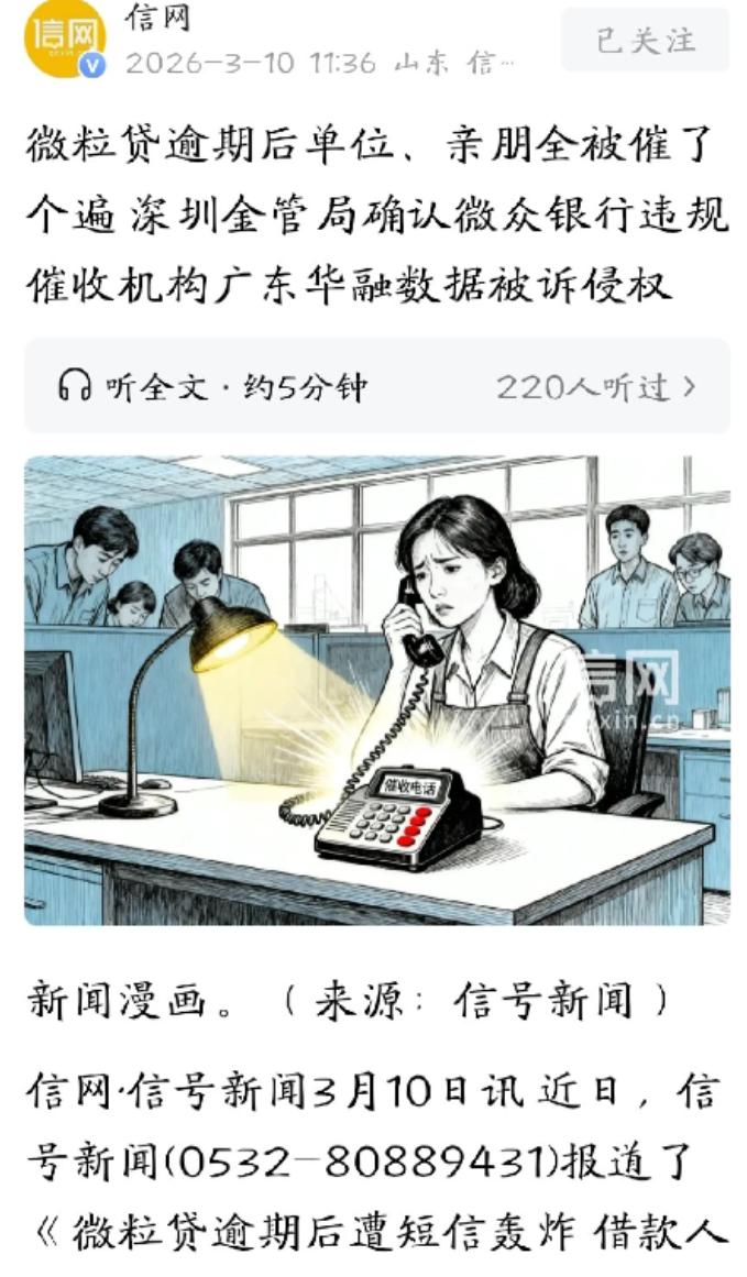 广东深圳,女子着急用钱,就连续在微粒贷上借了两笔,分别是4万元和2.5万元,可事后没能按时还款,竟收到了平台的短信轰炸,最多的一天有十几条,就连单位同事和亲朋好友都被催了个遍,女子被折磨得受不了,一纸诉状告上法庭,经过法院深入调查,这才发现,给她发短信的竟然有6家公司,更可怕的是,仅其中一家公司,就将自己的个人信息转卖了7遍,这让女子后怕不已。 居住在广东深圳的一名女子因临时急需资金周转,通过微粒贷平台先后申请两笔贷款,金额分别为四万元与两万五千元,两笔款项合计六万五千元,资金到账后女子按计划使用,却因后续资金安排出现问题,未能按照约定时间履行还款义务,贷款随即进入逾期状态。 从逾期之日起该女子的手机开始频繁收到催收短信,发送号码多为1068、1069等平台号段,也夹杂虚拟手机号与异地私人号码,短信内容多带有委托催收、提醒履约等表述,催收频率不断升高,最频繁时单日可收到十几条短信,持续的信息轰炸让女子正常生活受到严重干扰。 更让她难以接受的是,催收行为并未局限于联系本人,其工作单位同事、身边亲友均接到催收电话与信息,债务情况被无关第三方知晓,个人声誉与工作生活秩序均受到影响,长期的骚扰与精神压力让女子不堪其扰。 在多次沟通无果后,她决定通过法律途径维护自身合法权益,将微粒贷运营方及相关催收主体一并诉至人民法院,请求依法认定对方催收行为侵权,并保护个人信息安全, 案件受理后,法院围绕催收行为的合法性、个人信息流转路径等关键事实展开全面调查。 随着证据梳理与事实核查,事件背后隐藏的违规信息流转链条逐渐清晰,法院查明,直接向该女子发送催收短信的主体共有六家公司。 这些公司在庭审中均主张仅提供短信发送通道服务,相关个人信息与短信内容均由微粒贷运营方深圳前海微众银行提供,且声称与银行存在合法合作关系,但均无法提供与微众银行直接签订的服务合同,也未能出具完整、连续的授权委托证明。 所有催收业务均来自多层级的转包与转接,其中仅广州亿合信息科技有限公司一家发送的催收短信,背后就牵扯出长达七家主体的信息流转链条,女子的姓名、联系方式、欠款情况等敏感个人信息。 从微众银行流出后,先后经玖沐数字科技有限公司、北京一见科技有限公司、苏州流羽网络科技有限公司、安徽云聚信息科技有限公司、杭州燚海峰华通信技术有限公司,最终转至广州亿合信息科技有限公司,仅这一条链路就完成六次转手。 相当于个人信息被反复转卖七次,信息流转过程完全脱离监管,也未获得当事人单独知情同意,法院进一步核实确认,微众银行在委托催收过程中,存在对合作机构管理失范、催收行为管控缺位、个人信息违规流转等问题。 相关催收机构超出合理范畴联系借款人亲友与工作单位,泄露借款人债务信息,高频次发送催收信息的行为已构成对当事人生活安宁与个人信息权益的侵害,而多层转包的信息流转模式,不仅违反个人信息保护相关法律规定中最小必要、禁止擅自转委托的原则,也让借款人隐私处于高度失控状态。 大量无关机构接触敏感金融信息,带来极大的信息泄露与滥用风险,该女子在得知个人信息历经如此多环节转手后深感后怕,意识到一次逾期竟让自身核心隐私在无管控的产业链中随意流转,后续潜在风险难以预估。 目前该案已依法审理完毕,法院结合查明事实,明确认定相关主体的催收行为与信息流转行为构成侵权,判令涉事机构承担相应法律责任,同时要求平台方规范催收流程、严格管控个人信息流转。 这起案件源于普通的借款逾期纠纷,却通过司法审查揭开了互联网金融催收领域的乱象,也为金融机构合规经营、个人信息依法保护提供了明确司法指引。 既提醒借款人理性借贷、按时履约,也警示金融机构与第三方服务机构,必须严守法律底线,规范催收行为,保护消费者个人信息安全,不得以任何形式违规泄露、转包、滥用用户隐私信息。