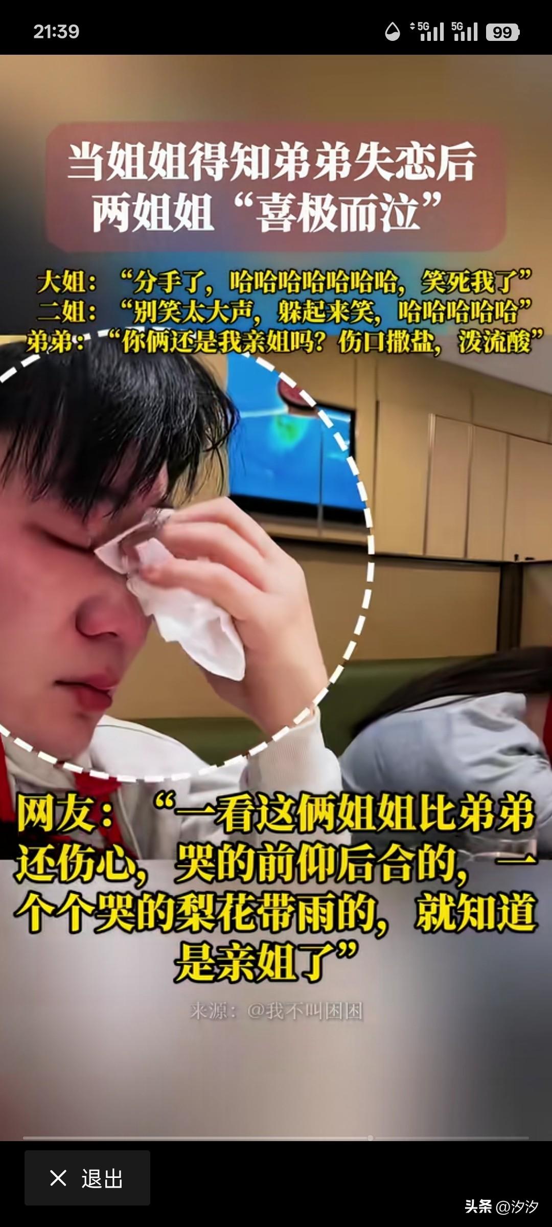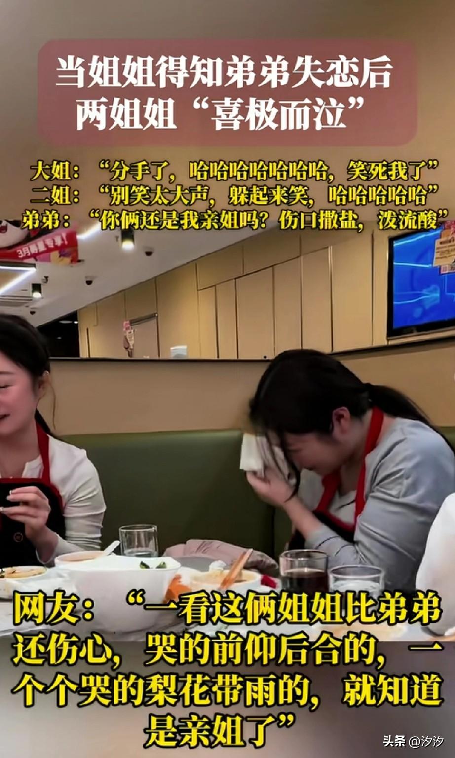 当亲姐姐得知弟弟失 恋之后, 大方的请了自己的弟弟吃了顿饭, 吃着吃着三个人就哭了, 弟弟是真的伤心哭了, 两个姐姐是喜极而泣, 大姐说分手了,哈哈哈,笑死我了! 二姐说别笑的太大声躲起来了笑, 弟弟表示你俩是真是我亲姐吗?还伤口撒盐, 这或许就是姐弟之间的相爱相杀, 每当弟弟出了一点事儿, 最开心的就是姐姐了, 这是独生子女体验不到的快乐, 都说弟弟是块宝, 但没想到姐姐是那把将石头剃成宝刀, 一看弟弟和姐姐相处的就很好, 最软弱的时候,只有姐姐来插刀, 看一遍笑一遍, 大家觉得这样的家庭好玩吗? 请用一句话激励我走出失恋阴影 怎么才能走出失恋