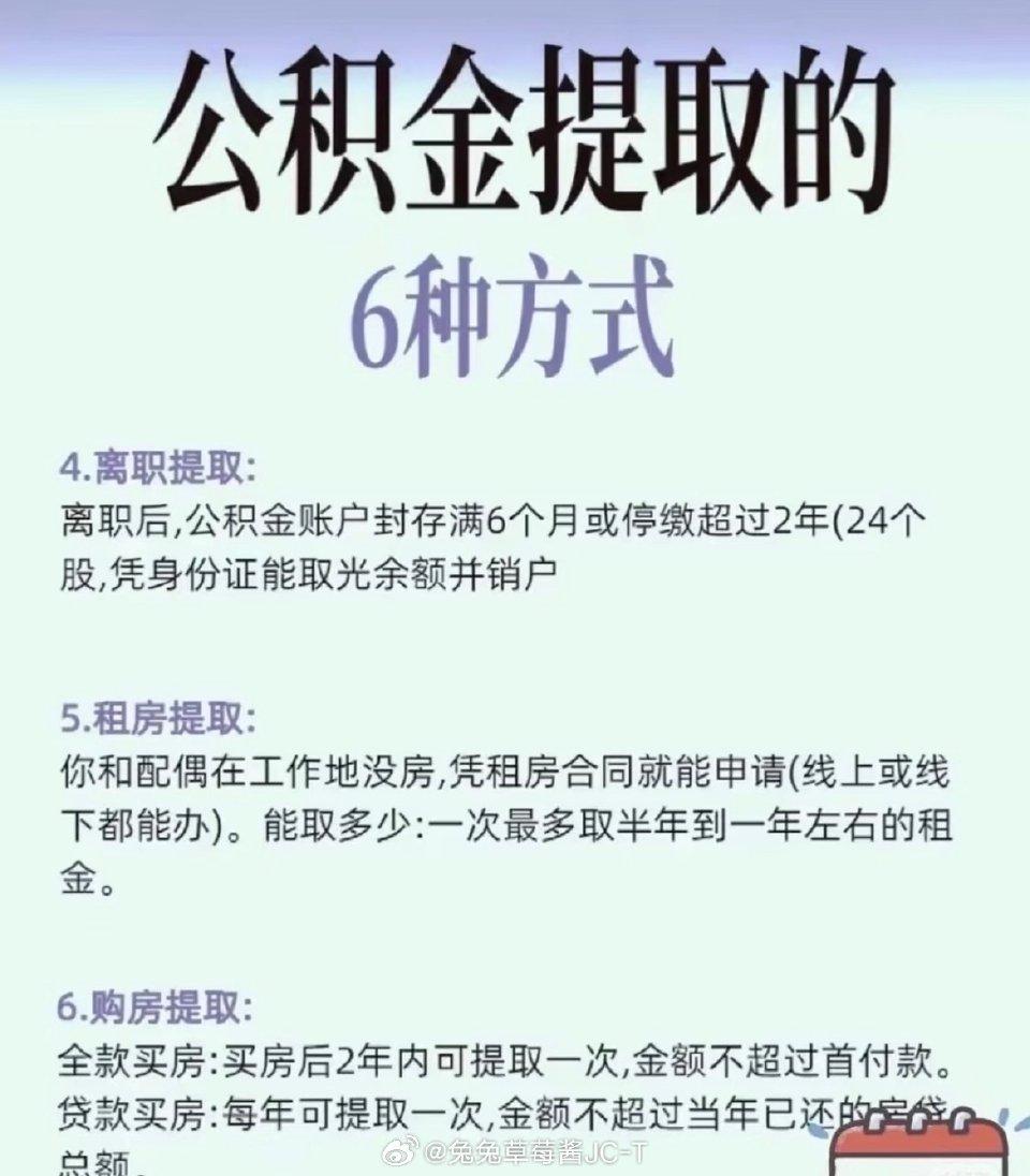 收藏!公积金6大提取方式全攻略,事关你的钱袋子 公积金不只是买房能用,这6种提取方式能帮你解决燃眉之急,赶紧码住! 退休人员可凭身份证,未达退休年龄的带退休证或批文,一次性提取账户余额并销户;出国定居者持户口注销证明或国外定居证明,也能全额提取并注销账户。 职工离世后,继承人凭死亡/销户证明、身份证及亲属关系证明办理提取,金额超1万需公证书或法院判决书,多人领取需其他继承人签字同意。 离职后账户封存满6个月或停缴超2年,凭身份证可提取全部余额;租房提取更方便,凭租房合同线上线下都能办,一次可取半年到一年租金。 买房提取也分情况:全款买房2年内可提一次,金额不超首付;贷款买房每年可提一次,金额不超当年还贷总额。