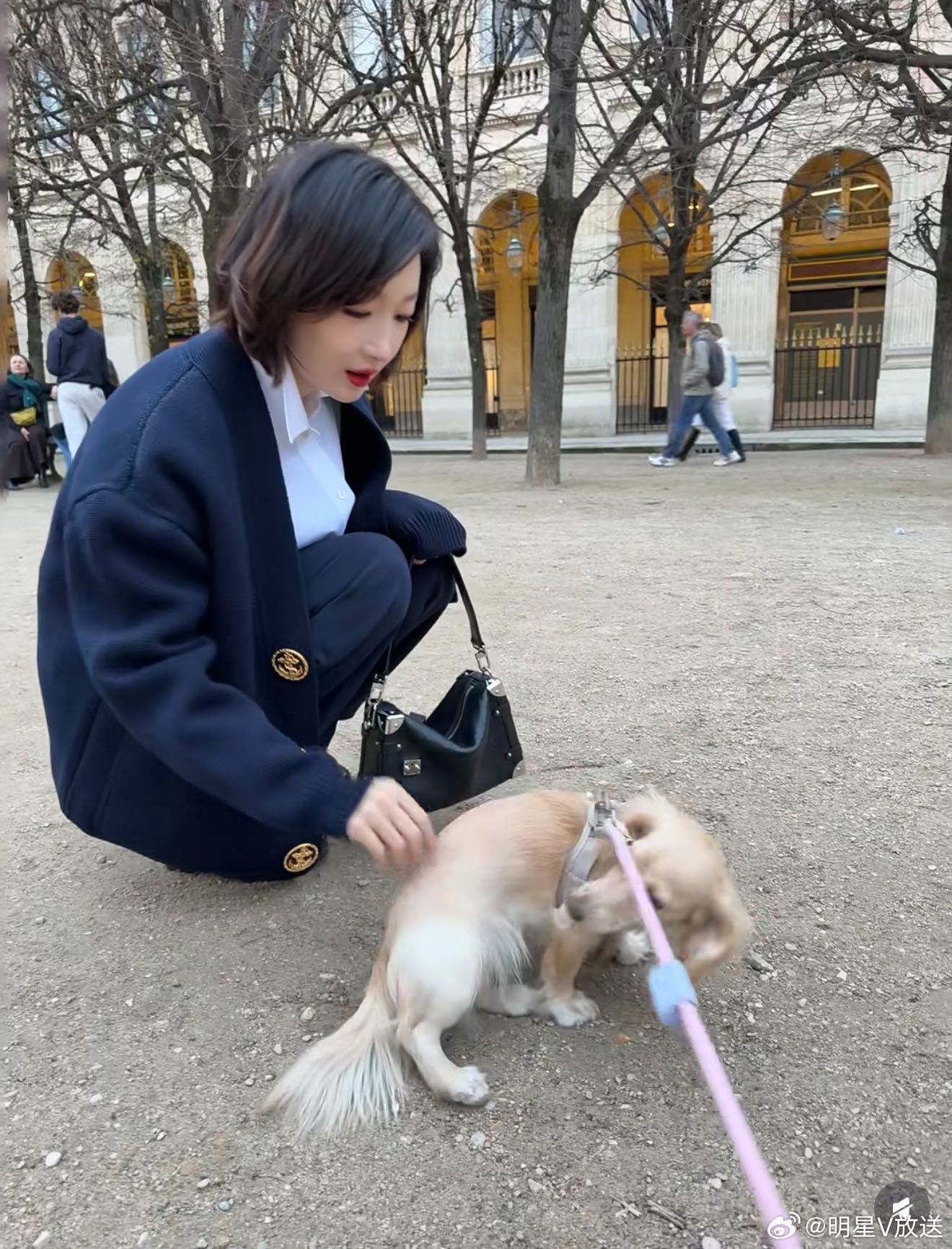 周冬雨在时装周偶遇小狗 周冬雨逗小狗这一幕真给我萌化了!简直演我偶遇小狗的样子,