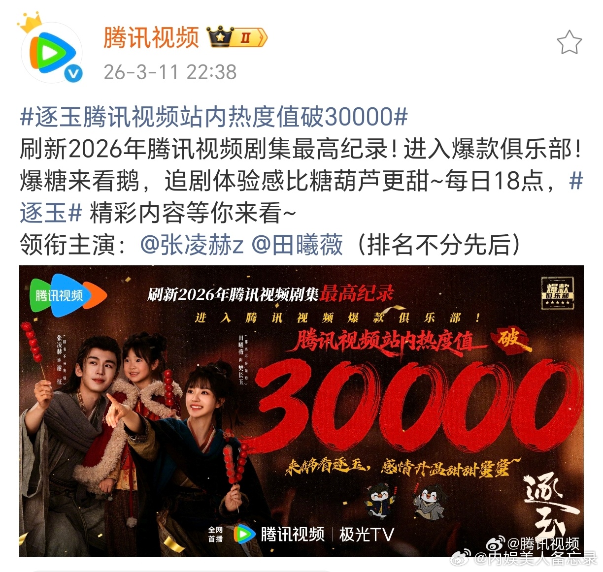 张凌赫 田曦薇《逐玉》腾讯爱奇艺双双破万首部双平台破万剧,怎么说?逐玉双平台破万