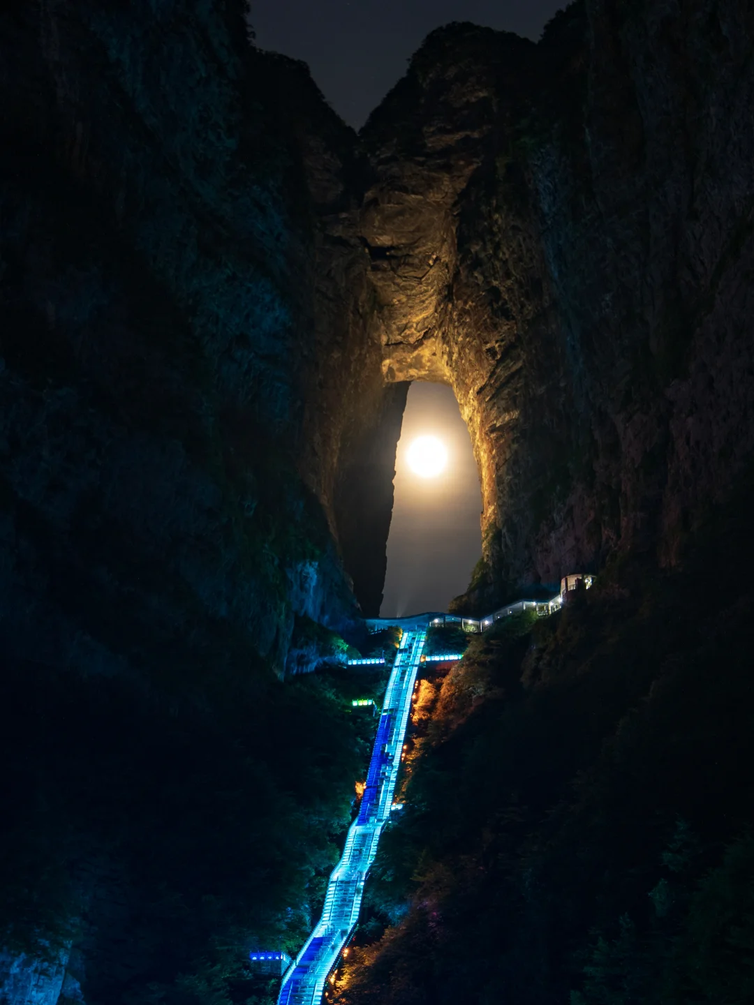 2⃣️天门洞999级台阶:仰拍洞口+人物剪影。