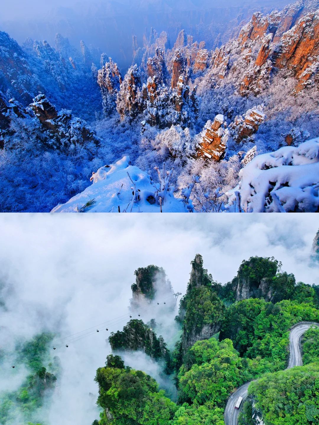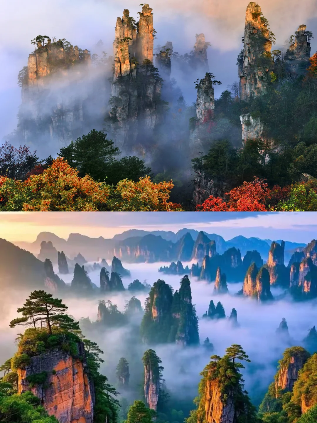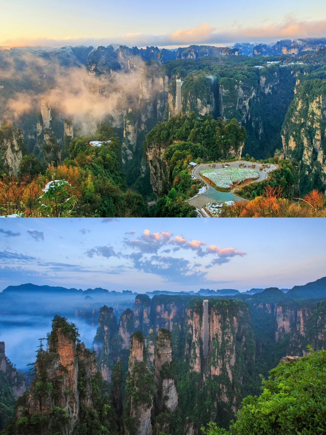 1⃣️袁家界“阿凡达悬浮山”:乾坤柱观景台上午逆光拍,云雾缭绕超仙。