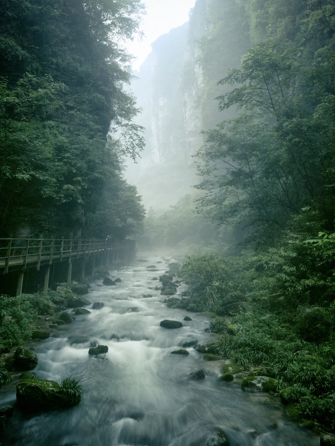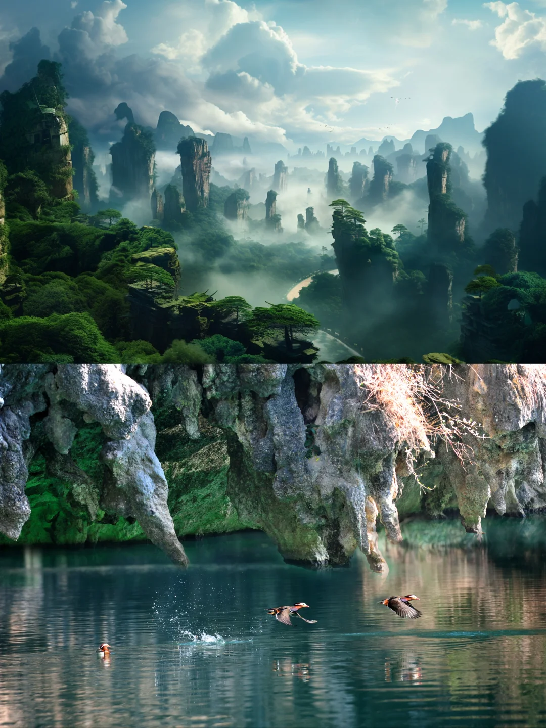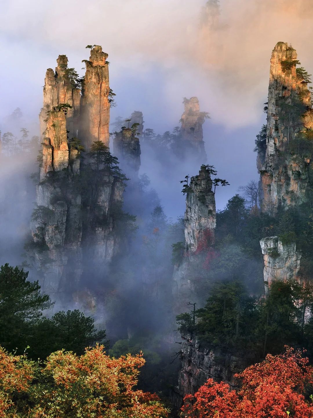 1⃣️袁家界“阿凡达悬浮山”:乾坤柱观景台上午逆光拍,云雾缭绕超仙。