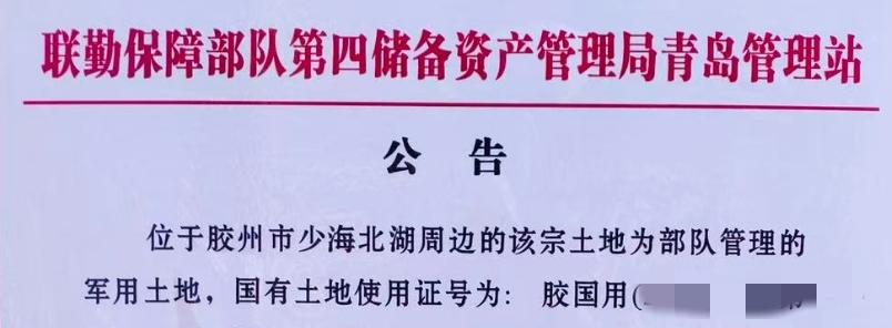 新年生活图鉴近日,位于青岛胶州市少海北湖片区林溪世家观澜小区前方的一块规划用地张贴了一份来自“联动保障部队第四储备资产管理局青岛管理站”的正式公告,据业主昨日爆料,该地块为部队管理的军用土地,已经暂时停工。