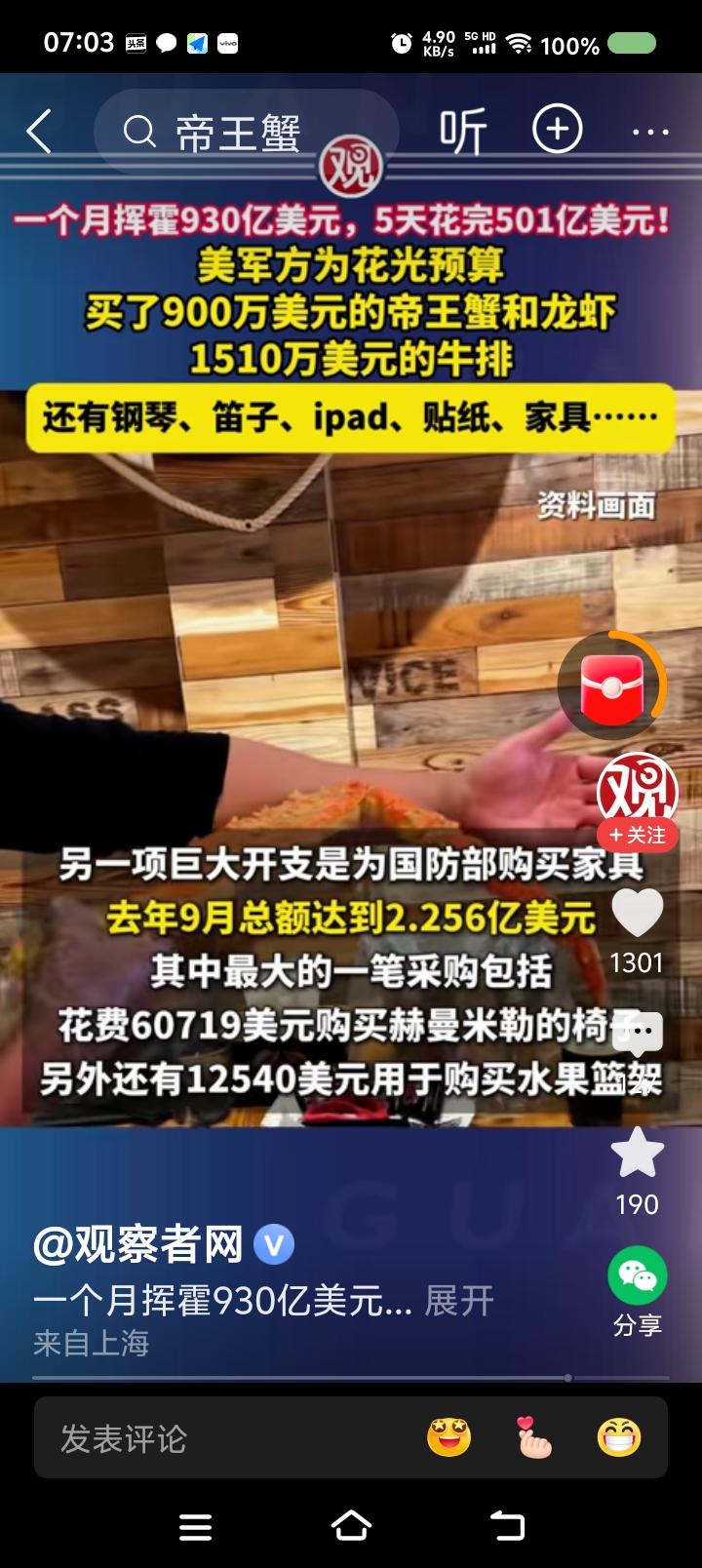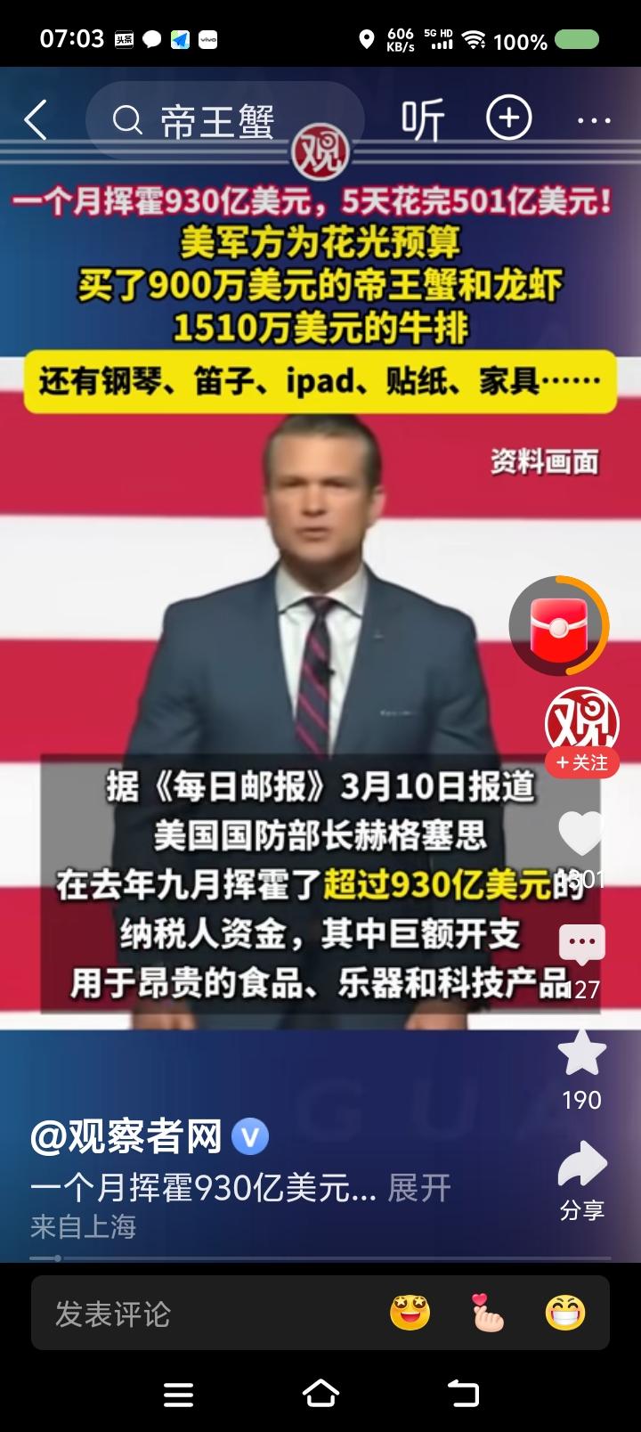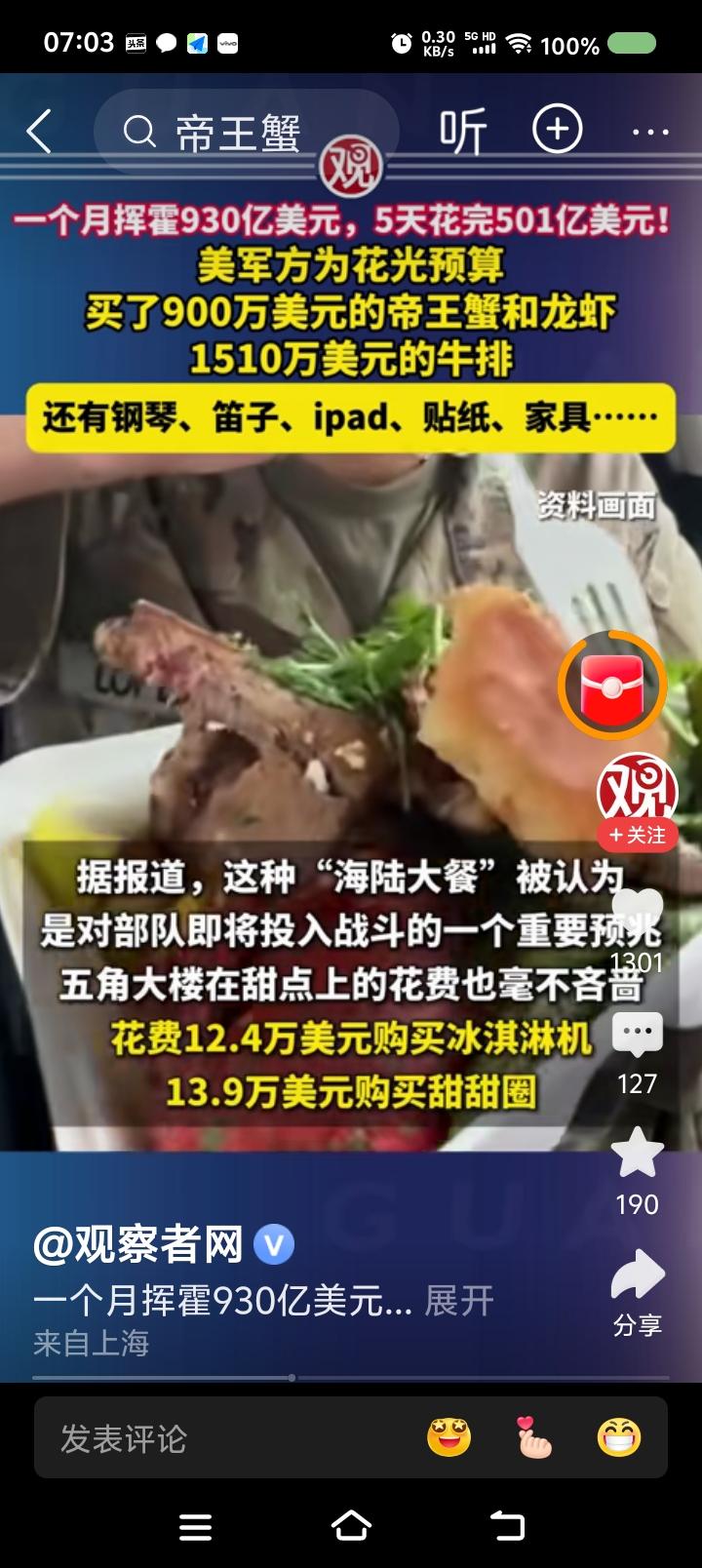 美国还是不缺钱!—— 据报道,去年9月,美国国防部为了在财政预算到期前花光剩余款项,挥霍了930亿美元。开支包括:昂贵食品、电子产品、乐器,等等。约一半的开支最后五天花完的。 某空军官员的官邸购置了九万多美元的三角钢琴。 水果篮架花了一万多美元。 购物单里还有卡通人物贴画:《汪汪队立大功》、《爱探险的朵拉》。 点评: 一、有个AI视频:美军遭遇中国战机攻击,物资匮乏,战地记者用蹩脚的汉语说:“虽然我们啥都缺,但有坚强的意志!” 建议把这视频与这个新闻放一起,滚动播出一个月,大标题是《我们美军有力量,大闸蟹900万美元》。 二、特朗普,你脸红么? 美国人,你们脸红么? 三、以此为鉴,中国人民解放军应加强纪律、作风建设,永葆优良传统,牢记毛主席的话:“贪污和浪费是极大的犯罪。”