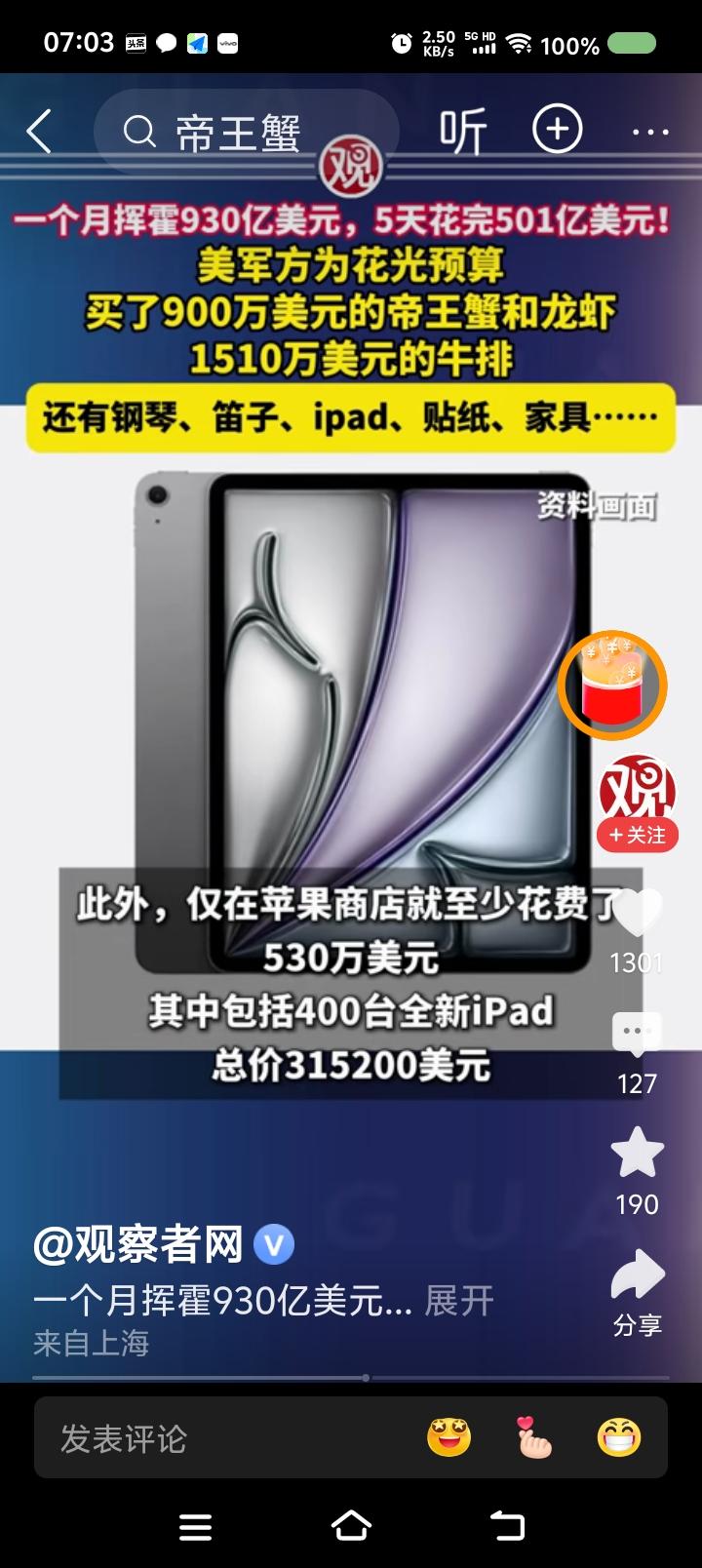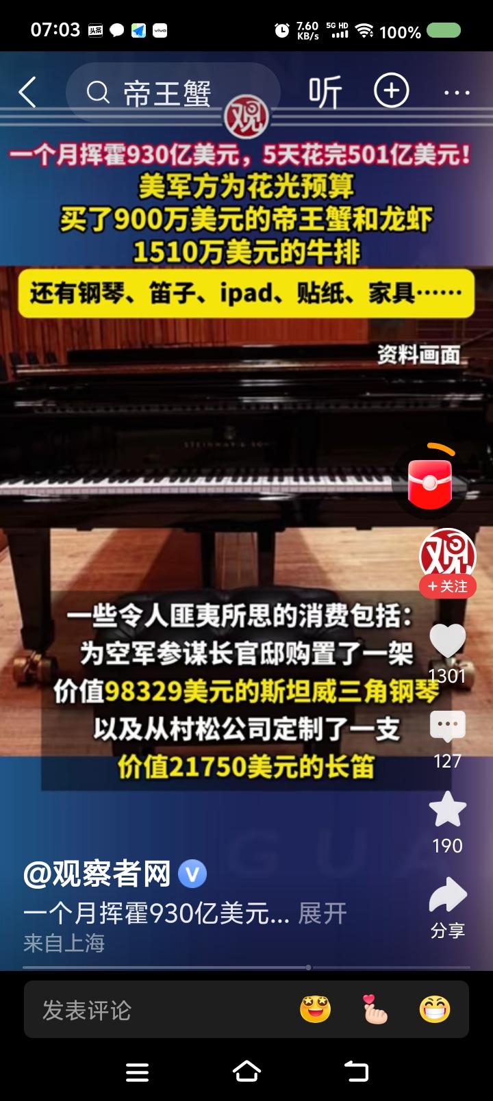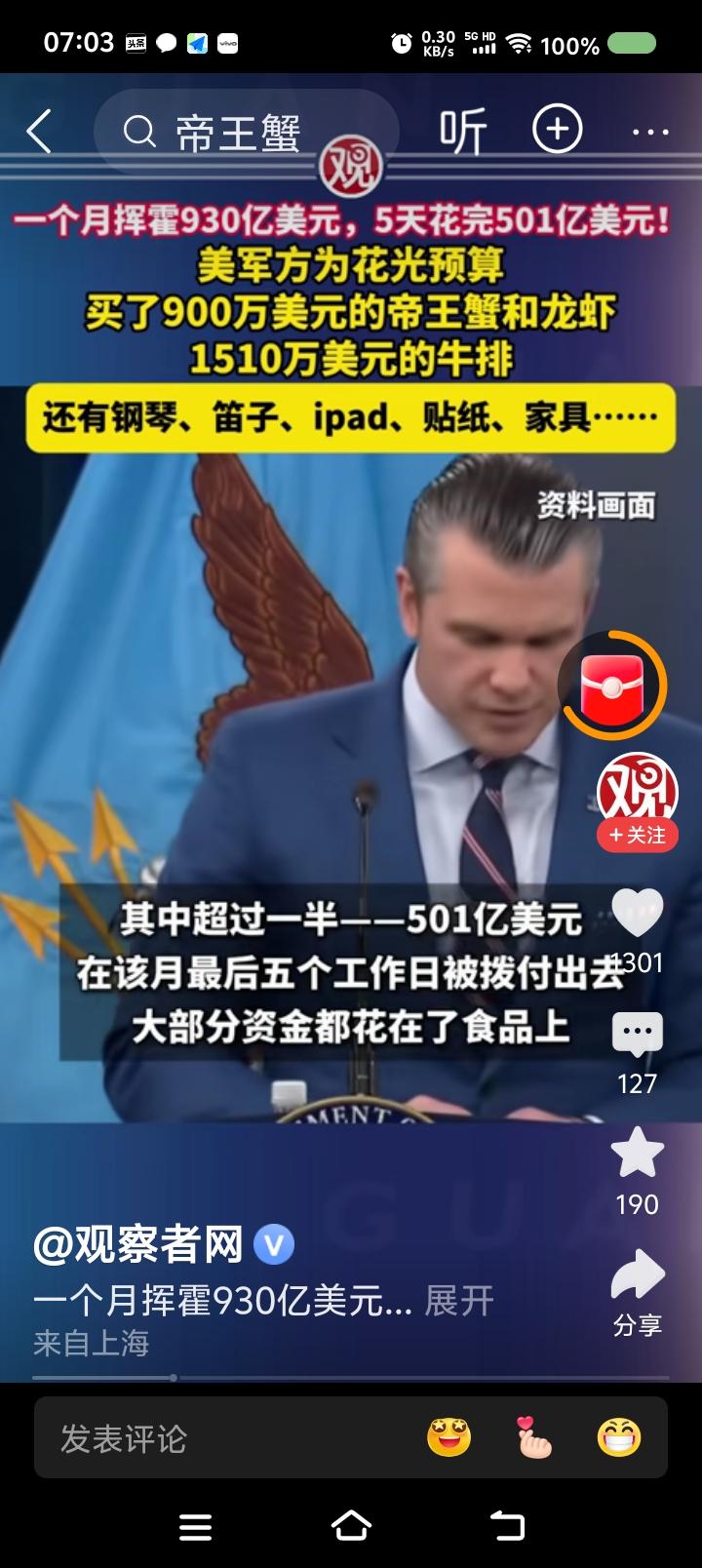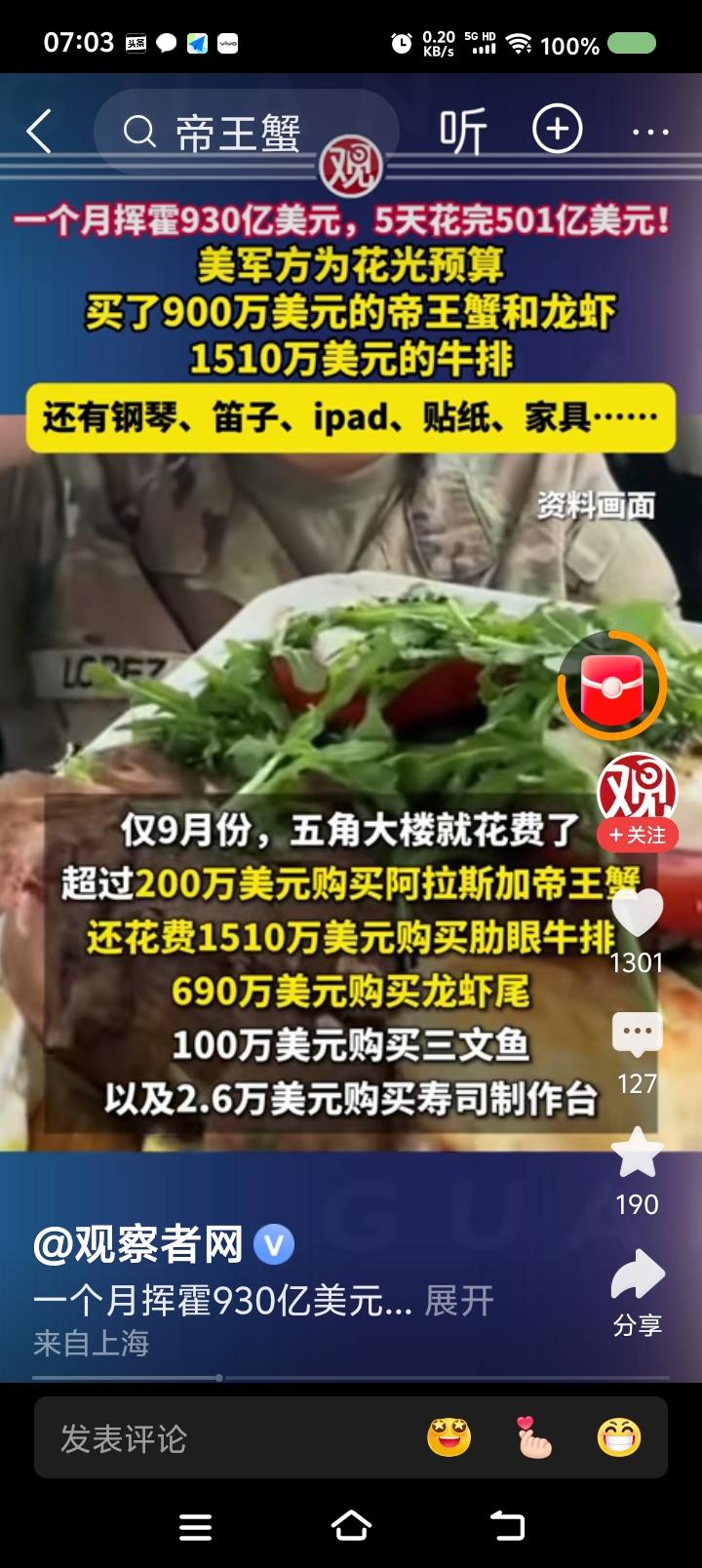 美国还是不缺钱!—— 据报道,去年9月,美国国防部为了在财政预算到期前花光剩余款项,挥霍了930亿美元。开支包括:昂贵食品、电子产品、乐器,等等。约一半的开支最后五天花完的。 某空军官员的官邸购置了九万多美元的三角钢琴。 水果篮架花了一万多美元。 购物单里还有卡通人物贴画:《汪汪队立大功》、《爱探险的朵拉》。 点评: 一、有个AI视频:美军遭遇中国战机攻击,物资匮乏,战地记者用蹩脚的汉语说:“虽然我们啥都缺,但有坚强的意志!” 建议把这视频与这个新闻放一起,滚动播出一个月,大标题是《我们美军有力量,大闸蟹900万美元》。 二、特朗普,你脸红么? 美国人,你们脸红么? 三、以此为鉴,中国人民解放军应加强纪律、作风建设,永葆优良传统,牢记毛主席的话:“贪污和浪费是极大的犯罪。”