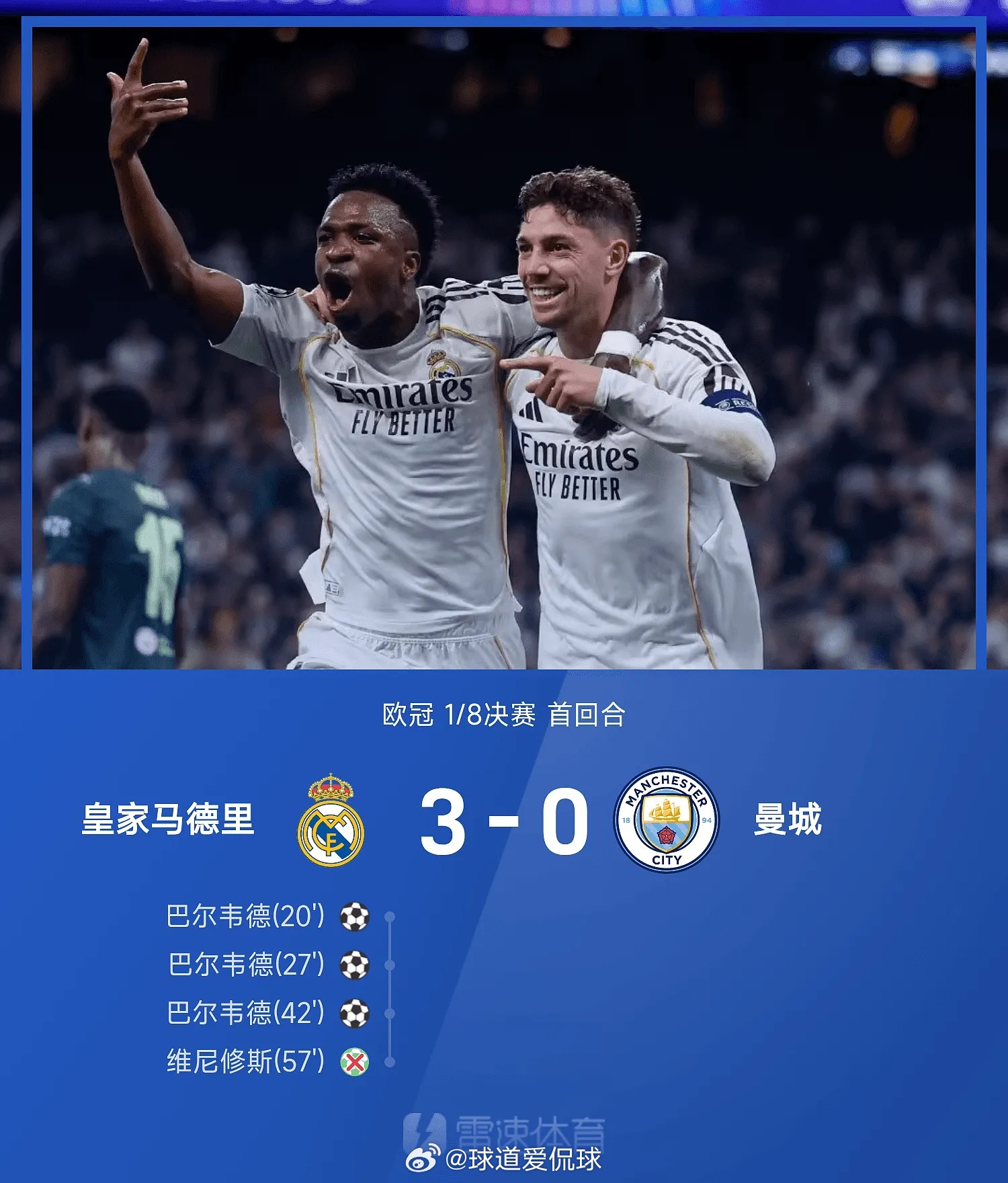 03月12日讯 25/26赛季欧冠1/8决赛首回合,皇家马德里主场以3-0大胜曼城抢得先机。上半时比赛,巴尔韦德的表现异常抢眼完成帽子戏法,助皇马早早取得3球优势,下半时维尼修斯射失点球。欧冠皇马曼城皇马3比0曼城足球