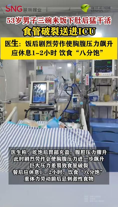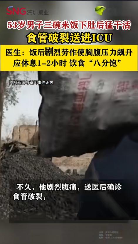 “悲剧还是发生了!”近日,湖南,一位53岁的矿工师傅,干完活后饥饿难耐,就回家连干了三碗大米饭。吃完饭也没休息,马不停蹄地又扛起煤土来。没想到不久后他肚子开始剧烈疼痛,被送去了医院,差点丢掉了小命。网友:饭后不要剧烈运动! 俗话说饭后百步走,活到九十九。不过,吃完饭就运动的话,可能会适得其反,起到催命的作用。 据媒体3月11日报道,李先生是一位矿工师傅,平时都是干重体力活。事发当日,他刚干完活,觉得实在是太饿了,就回到家,就着辣椒炒肥肠,连续吃了三碗米饭。吃饱之后,李先生也不休息,就又回到工作岗位,扛起了煤土。 没干多久,李先生就觉得不舒服起来,肚子里传来一阵阵剧烈疼痛,被紧急送往了医院。 医生检查发现,李先生食道出现了破裂,而且还诱发了呼吸衰竭和脓毒症,随时都有生命危险,整个人的生命体征都稳不住了,立刻进行了抢救。经过了十几天的治疗才脱离了危险。 医生提醒,吃饱后剧烈劳作会使人胸腹压力激增,很容易导致食管破裂。吃完饭之后应当休息1-2个小时。而且,平时饭也不要吃的太多,有个8分饱就行了。准备做重体力劳动的,在劳动前后也不要吃刺激性的食物,防止造成消化道损伤。 网友看后表示,都说吃饱了饭好干活,吃饱了饭千万不要直接干活!该歇就得歇! 信息来源:《【53岁矿工“吃饱了猛干活”食管破裂送进ICU】》深圳新闻网