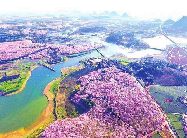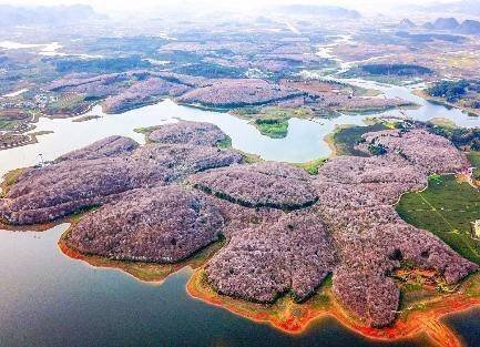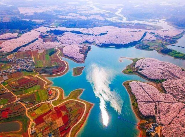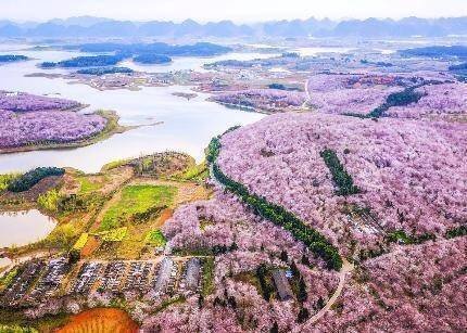 正是樱花绽放的季节。平坝农场的樱花也将盛开,山水围绕,半岛上有一团团、一簇簇粉粉