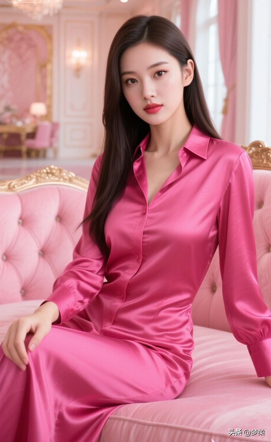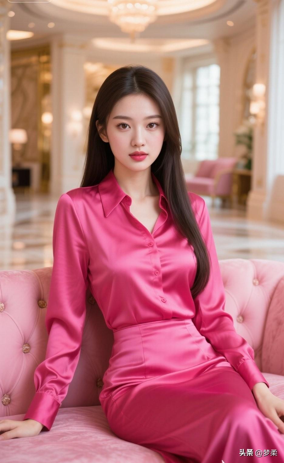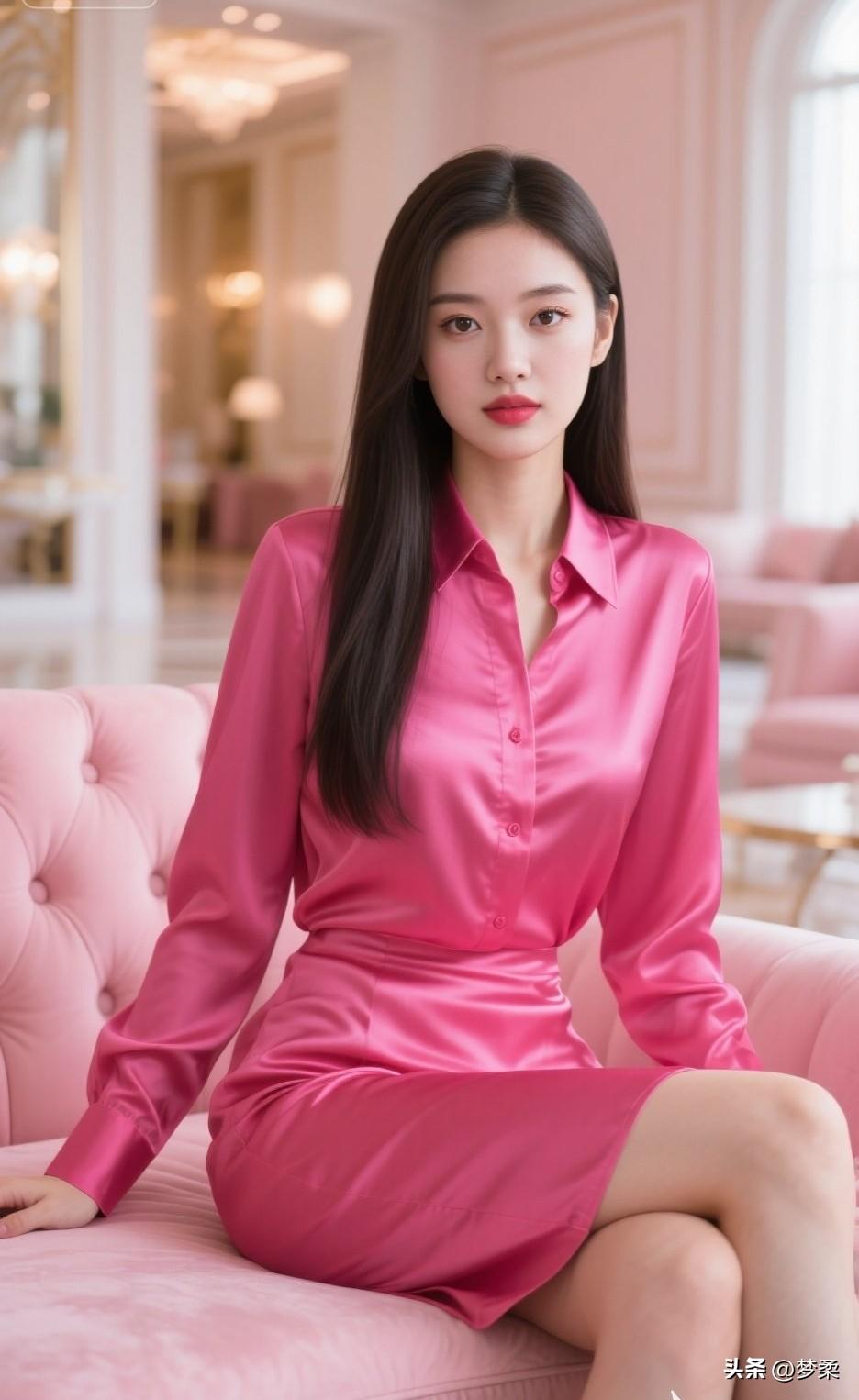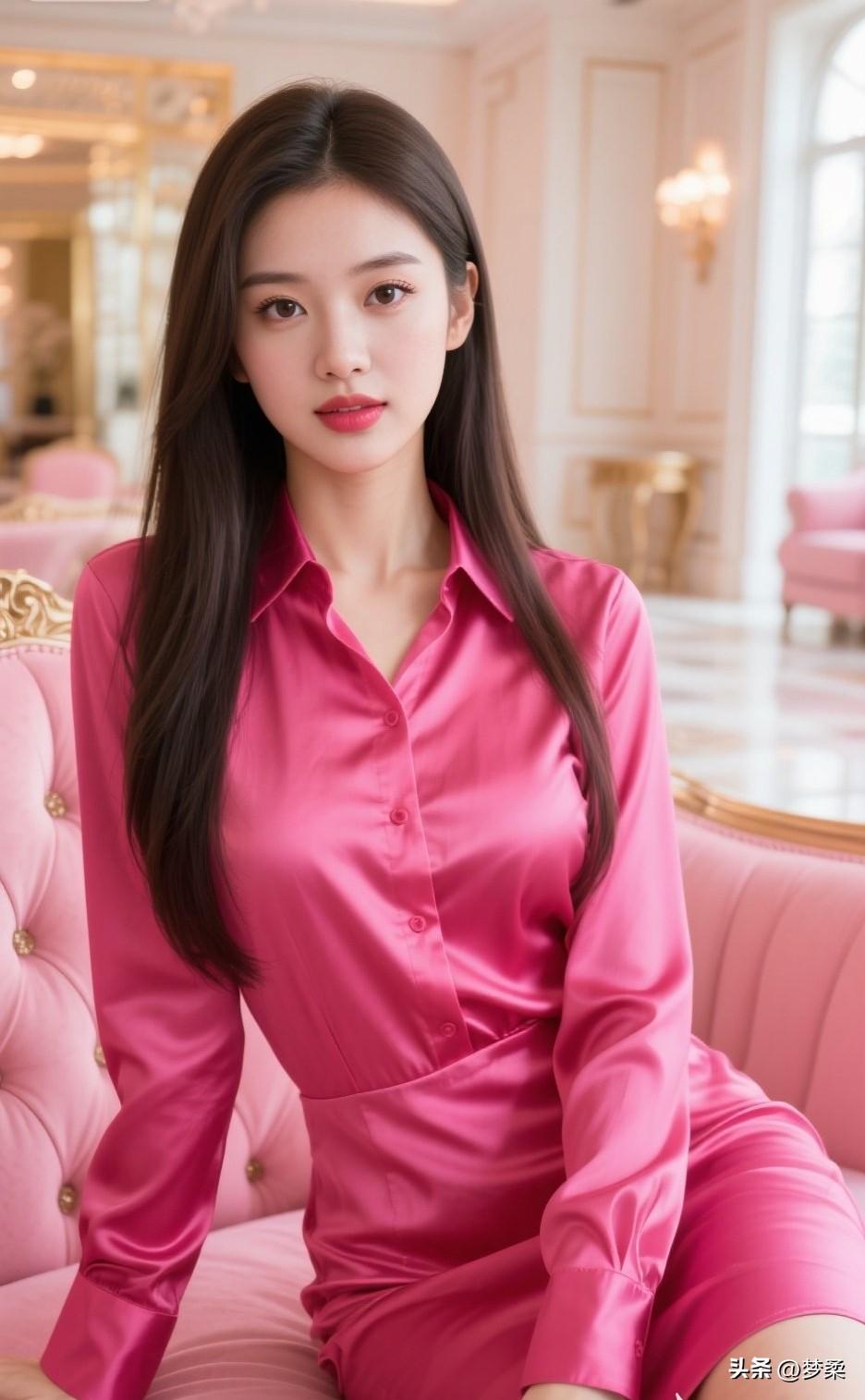 优雅粉裙少女,坐于粉色沙发,尽显甜美气质!💖✨