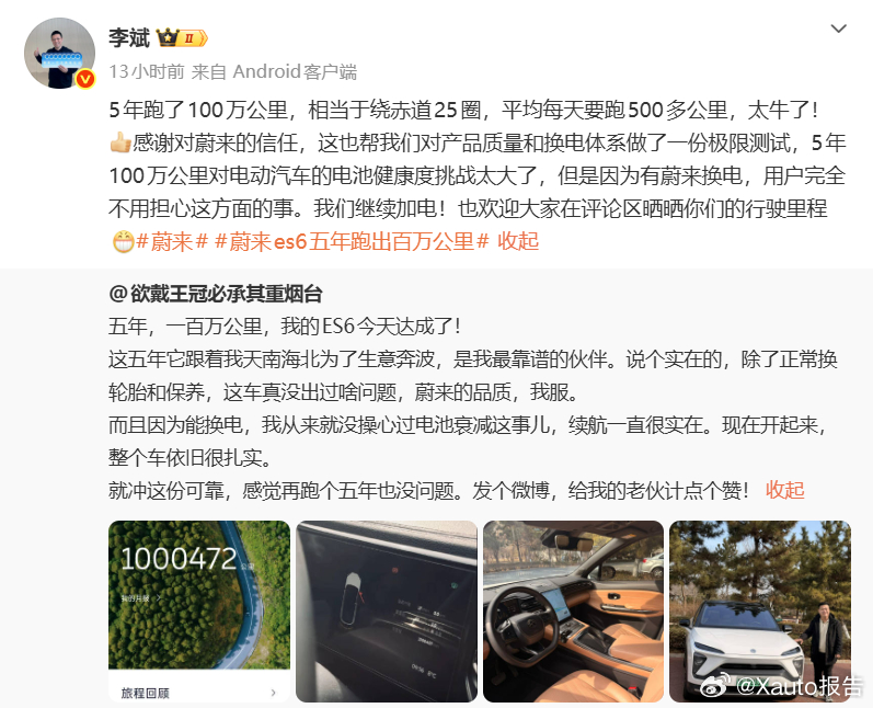 蔚来ES6车主五年行驶1000472公里,1961天日均500多公里,仅做常规轮胎更换与保养,车辆无故障。车主称换电模式使其无需担忧电池衰减,续航依旧扎实。蔚来董事长李斌回应,100万公里相当于绕赤道25圈,验证了换电体系与整车质量,并指出换电可保持电池健康度、提升二手车保值率。蔚来蔚来ES6五年跑出百万公里蔚来es6