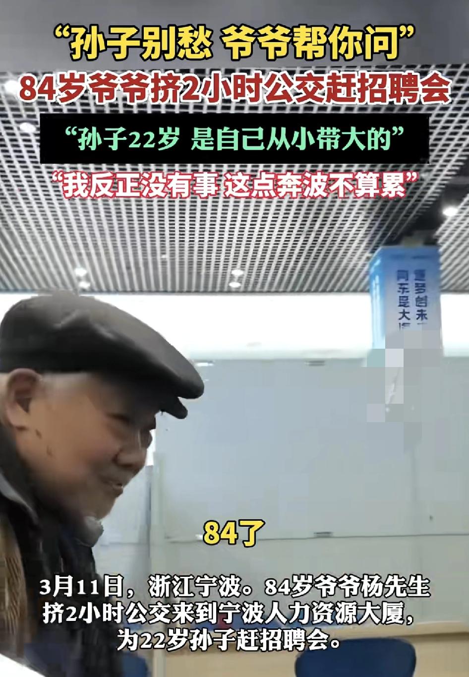 宁波一位84岁的爷爷挤两个小时公交车,指未来到人才市场,为自己22岁的孙子找工作爷爷说孙子是他从小到大的这一点奔波并不算累,自己的孙子读的专业是信息管理希望能够找到对口的工作。不过对于爷爷的这份好意,不少网友还是觉得找工作还是得自己来。那也有网友觉得社会已经很内卷了,能有一个这么支持自己的人,最起码信心方面已经赢了别人。