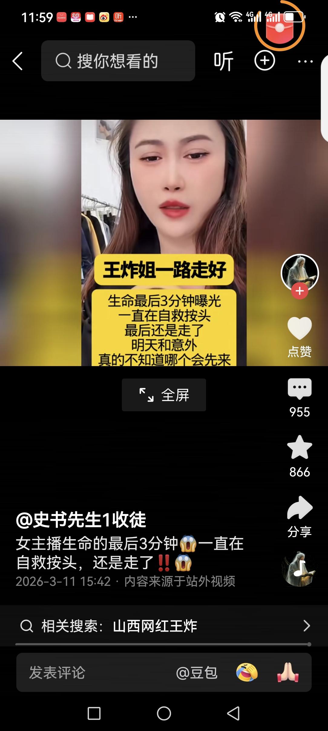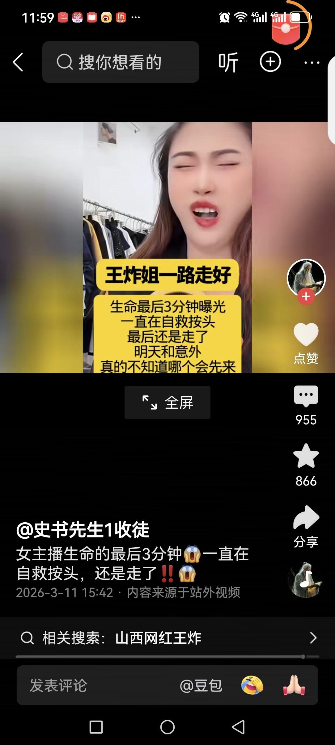 真没想到,好好的一个人,说没就没了! 看了网红“王炸姐”生命最后三分钟的视频,才深刻的体会到了什么叫做生命无常? 视频中的她,开始的时候,还在神采奕奕的向粉丝介绍她卖的服装。说话间就神情凝重,一个劲按着自己的头说头疼,边按边说,不行了,让同伴给她打120救护车。 中间她还在同伴的搀扶下去吃了几口水,喝完水又坐镜头前,按着自己的说,到底是怎么回事,是不是脑供血不足? 让网友万万没想到的是,这竟然是她最后的挣扎。一个鲜活的生命,在网友的注视下,就这样香消玉殒! 不得不感叹生命的脆弱! 让人好奇的是,到底是什么突发疾病夺走了她年轻的生命?到底是脑出血,还是心梗呢?如果她身边有颗速效救心丸,是不是能救她一命呢?
