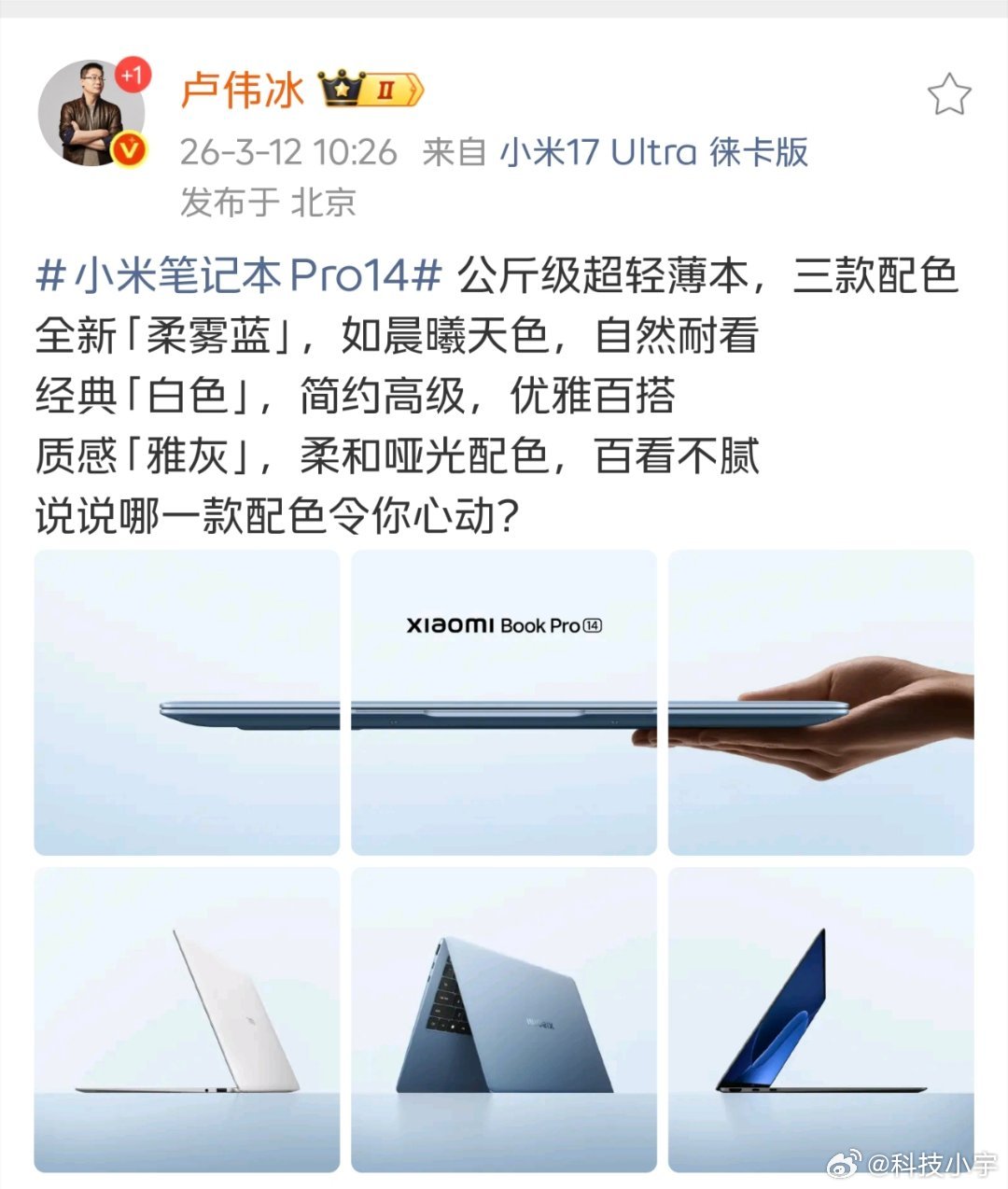 来了! 小米品牌时隔四年重新发布笔记本,四年了,小米终于重回笔记本战场,而且一上来就王炸——直接冲击Windows本的珠穆朗玛峰:公斤本! 公斤本从来不是便宜货,碳纤维、钛合金、全定制模具,每一克都是钱。看看ThinkPad X1 Carbon、XPS、MateBook X Pro,基本是1.5万起步,小米应该会便宜一些,我反而觉得良心。现在就是未来一年最便宜的时候,早买早享受,晚买...晚买更贵! 人车家生态最后一块拼图,手机、平板、车机都有了,就缺笔记本这个"生产力中枢"。这次补齐后,全生态无缝流转终于闭环,这才是真·生态。 Win本颜值巅峰,鹅卵石设计、高级材质,用MacBook Air的颜值做MacBook Pro的性能,Windows阵营终于有能打的了!卢伟冰官宣小米笔记本新品即将发布