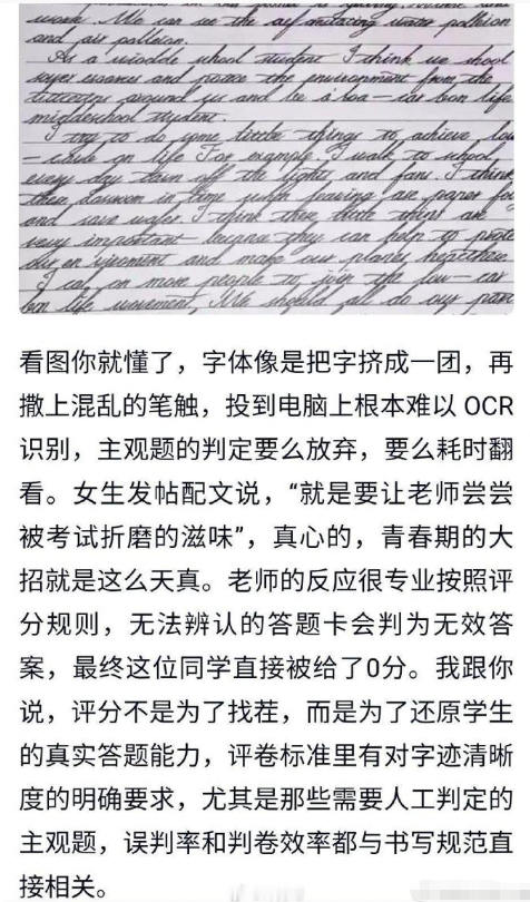 高三女孩用“咯噔字体”写卷子,老师:无法判卷,直接0分。