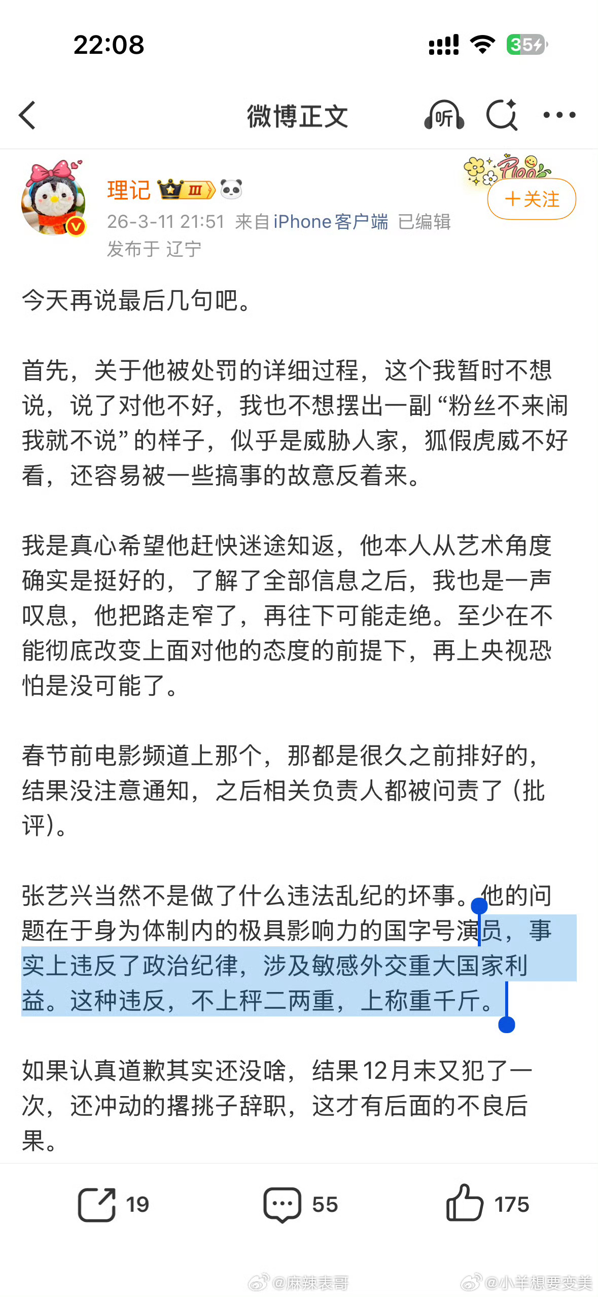 理记再度发文,直指张艺兴与国家话剧院的争议持续发酵。其认为,张艺兴身为国字号背景艺人,在敏感时期缺乏应有的政治觉悟,多次参与团体活动引发争议,还借国家话剧院身份进行不当背书,引发舆论对其身份与言行的双重质疑。张艺兴 国家话剧院