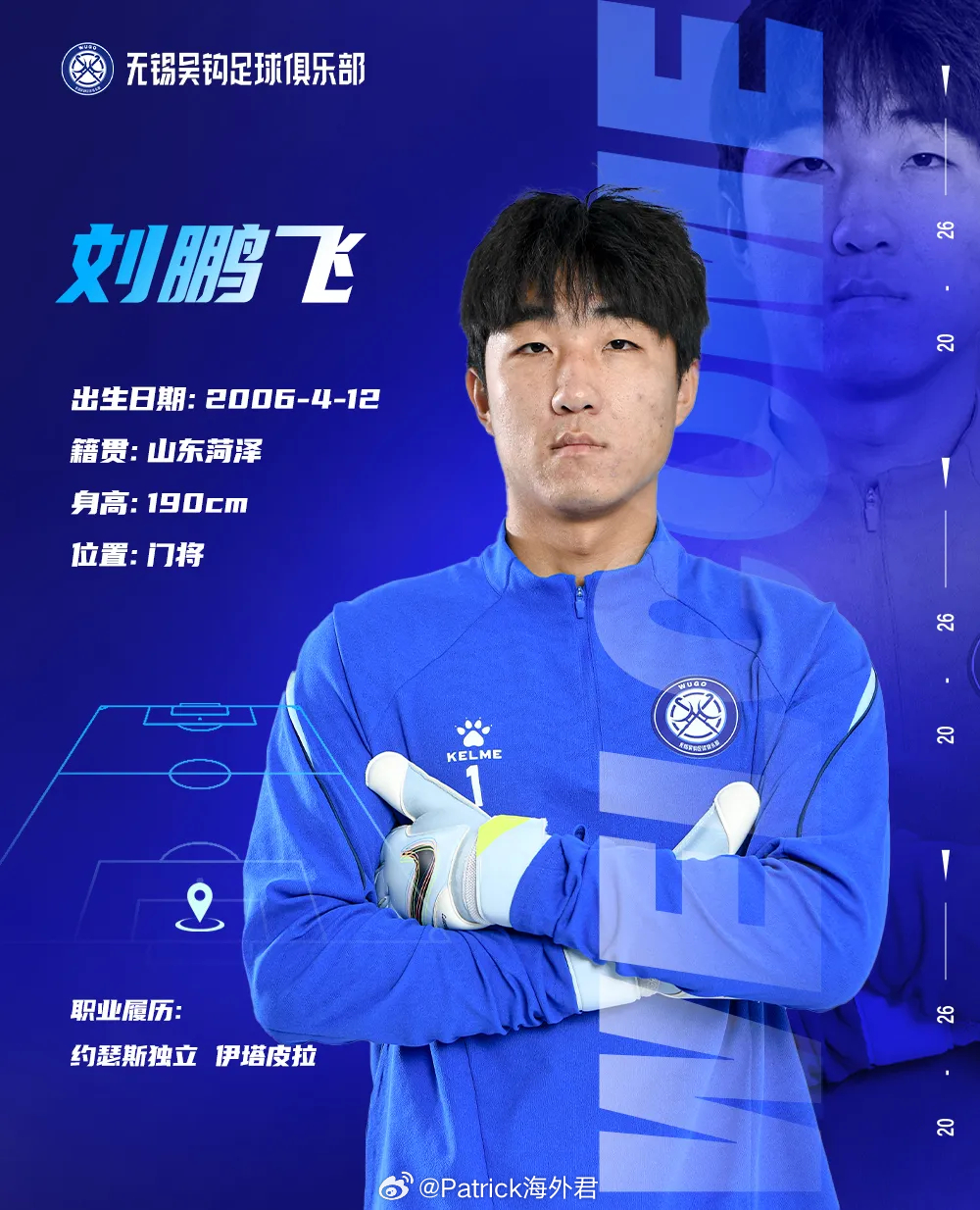 19岁巴西留洋门将 刘鹏飞 回国加盟中甲无锡吴钩。刘鹏飞出生于2006年4月,出国前来自辽宁大连。