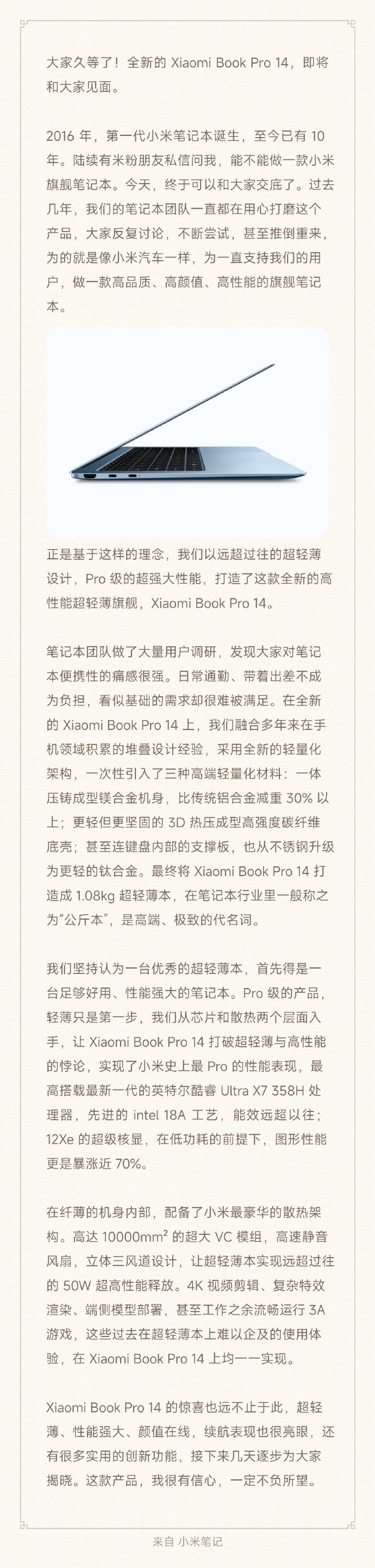 最狠的是性能,目前市面上公斤本性能释放普遍在40W,小米这次直接干到了50W。别小看这10W,这意味着离电也能跑3A大作,算是质的飞跃。用MacBook Air的重量做出了超越MacBook Pro的体验,这才是小米憋了四年的杀手锏。颜值也是Windows阵营的天花板,漂亮得不像实力派。总之,想体验顶级Windows旗舰的,这台可以蹲一下!卢伟冰官宣小米笔记本新品即将发布