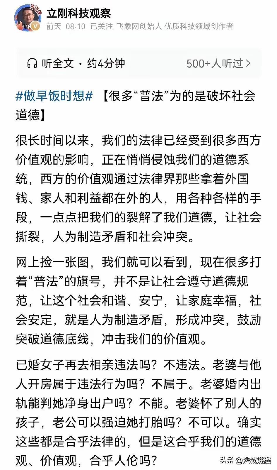 别再抹黑普法! 奇葩案件引发热议,恰恰体现了法治的反光——它照见了越来越多人开始相信法律、愿意用法律维护自己的权利,这才是法治中国最生动的模样。 最近看到一种谬论:说普法是教人学坏,甚至否定依法治国,这完全是颠倒黑白、误导大众! 法治中国建设以来,普法宣传真正走进了千家万户,越来越多的普通人开始懂法、信法、用法,愿意拿起法律武器维护自身合法权益,这是不争的事实。 为什么现在社会上会出现一些所谓“奇葩案件”,频频引发热议? 根本不是人心变坏了,而是法治意识真正深入人心了! 过去很多矛盾纠纷,大家要么忍气吞声,要么靠人情和稀泥,问题被掩盖;现在大家愿意走法律程序,愿意把是非曲直交给法律评判,才让这些原本藏在水下的小事、特殊事,摆到了台面上。 正是因为越来越多人遵守法律、维护法律,这些极少数的特殊案例才会显得格外突出,才会引发公众讨论。这种讨论,本身就是一次全民普法,让社会规则更清晰,让公平正义更可感。 普法,从来不是教人钻空子,而是教人守底线、懂权利、有敬畏。 依法治国,是社会稳定的基石,是普通人最坚实的依靠。 一个越来越好的法治社会,从来不是靠嘴上讲道德,而是靠人人守法律、人人用法律撑起来的。 抹黑普法、否定法治,才是对社会的不负责任! 普法社会 司法普法怪圈 普法新知 道德的约束力是不是越来越低了? 法律