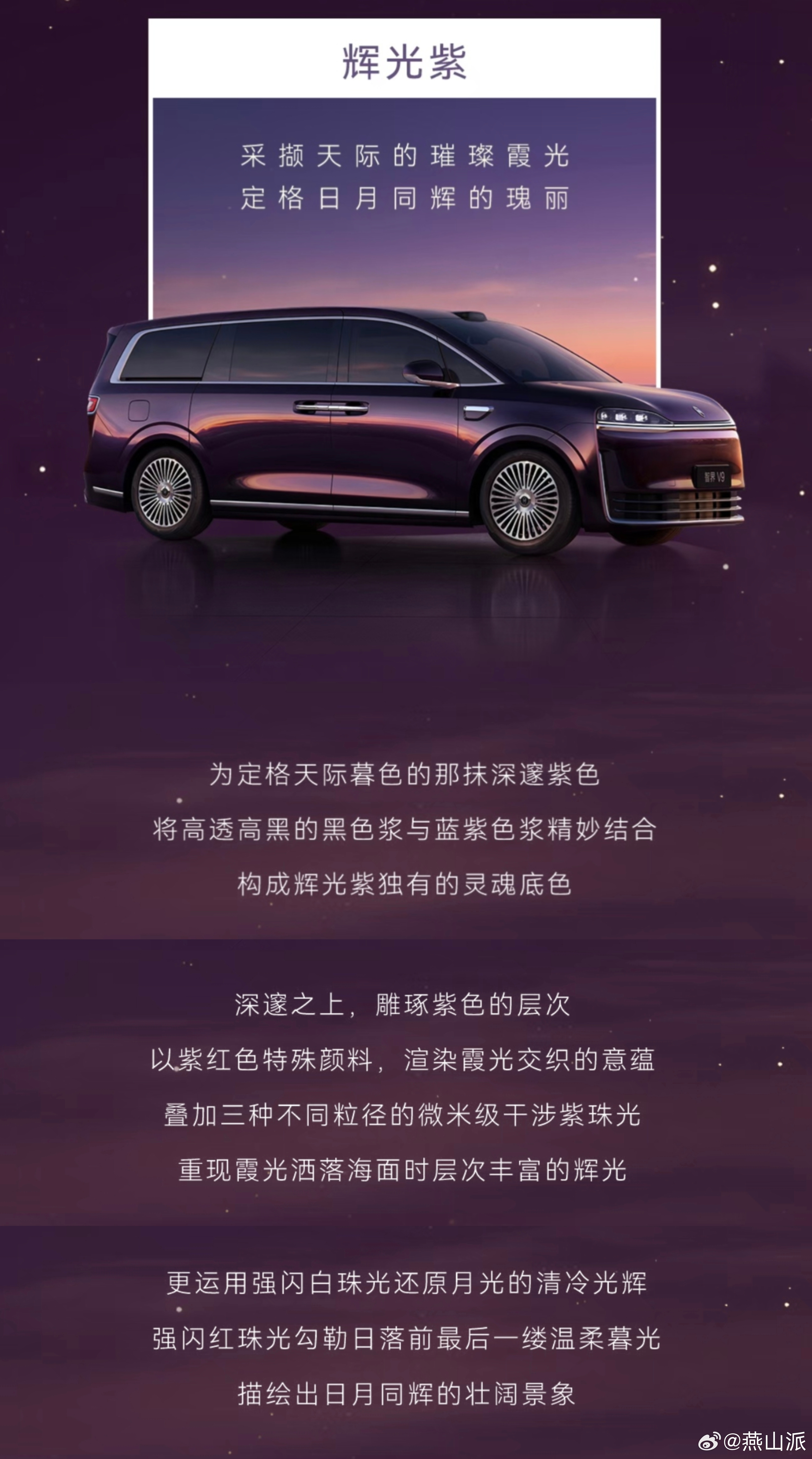 余承东曝光智界V9新色感觉都挺好看,纠结了,我应该选哪个?老铁们帮我推荐下 3月12日,余承东正式公布鸿蒙智行首款旗舰MPV智界V9的四款车身配色:辉光紫、深海蓝、雪域白、鎏金黑。四款车色灵感均取自自然奇景,历经超百道精密工序与突破性纳米研磨工艺打磨,最终呈现出细腻通透的漆面质感,尽显旗舰车型的品味与格调。不止于审美引领,智界V9或将搭载侧面迎宾光毯、车载制氧机等多项黑科技,让豪华与实用深度融合,以科技硬实力诠释“MPV科技车皇”的旗舰气度。