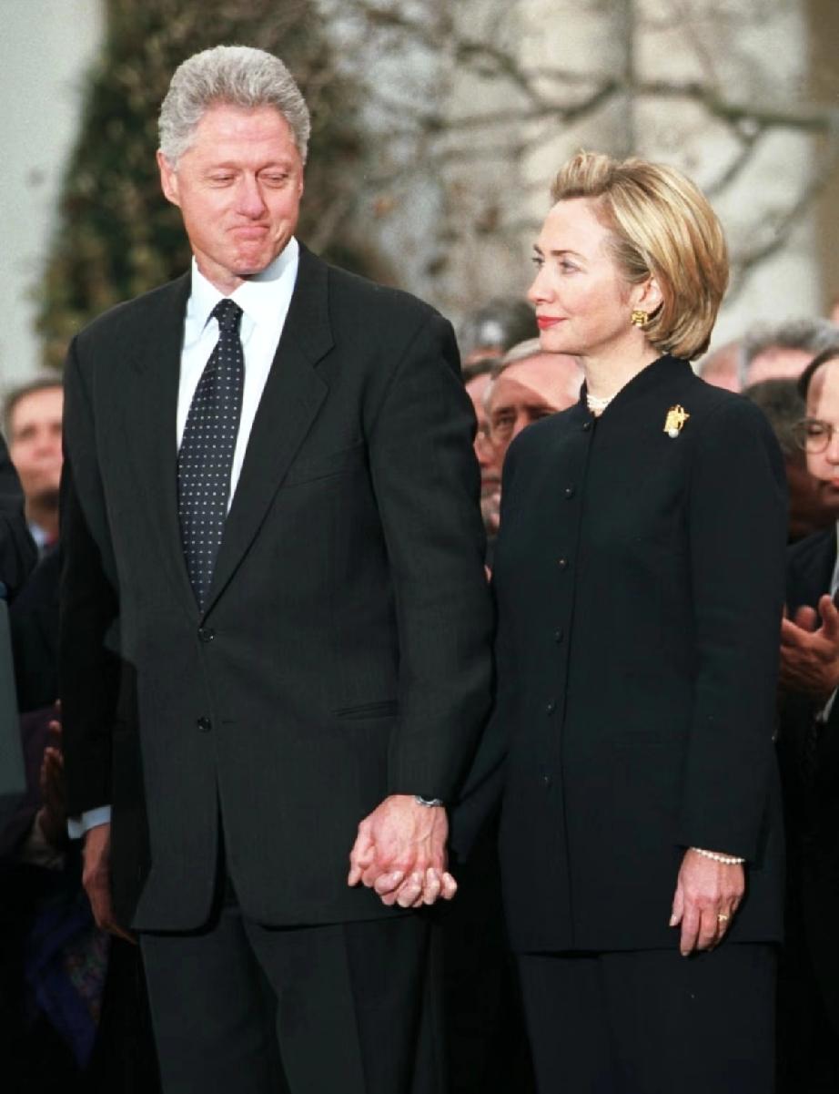 克林顿、希拉里夫妇在纽约麦迪逊大道散步,身边一共有7名工作人员围绕,夫妇两全程面
