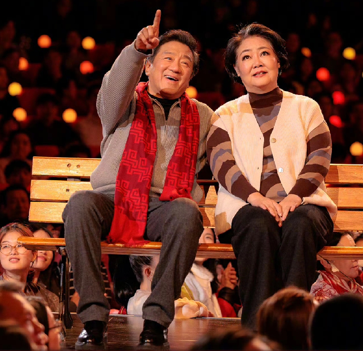央视晚会上,在《人世间》饰演宋佳雷佳音父母的丁勇岱和萨日娜表演节目《人间小满》。