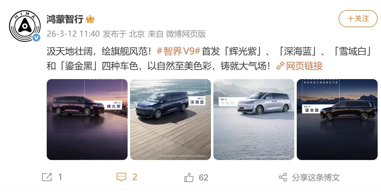 这才是豪车该有的奢华质感,智界V9车身配色正式官宣,让大家眼前一亮? 在车身配色上,智界V9为了满足不同消费的需求,打造了四款不同的配色,辉光紫、深海蓝、雪域白、鎏金黑,能够契合不同消费者的审美需求。采用了“晶钻阔境、星河开路”的设计灵感,加入“晶钻”、“星河”等自然意象,C字形设计的尾灯加上纯净光面造型,智界V9让高品质、高质感色彩成为主角。 并在中间贯穿式灯带内嵌百万颗精工晶钻,借助顶部光源,为用户带来“千人千灯”的专属光辉,在不同的视角有不同的视觉效果。这么漂亮的外观设计,而且还搭载多项首发黑科技,这不妥妥的就是MPV科技车皇啊!智界V9新色曝光
