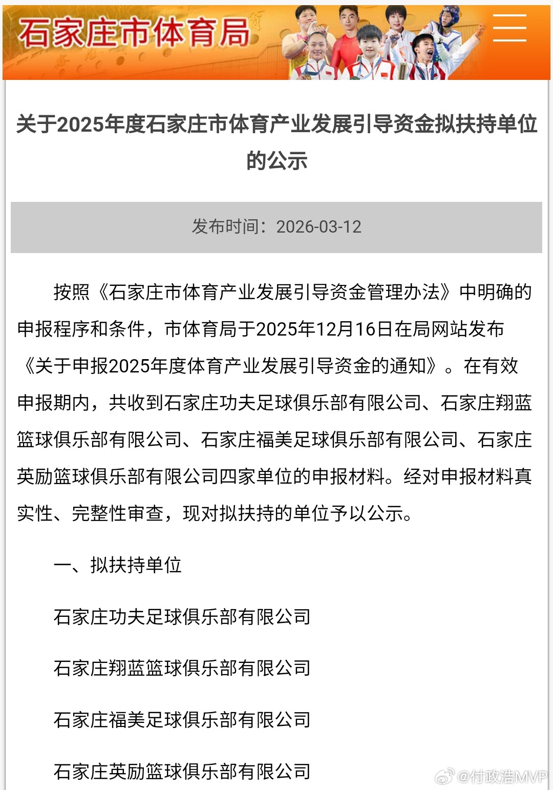 石家庄市体育局公示,将对石家庄功夫足球俱乐部、石家庄翔蓝篮球俱乐部、石家庄福美足球俱乐部、石家庄英励篮球俱乐部这四家职业体育俱乐部进行资金扶持。