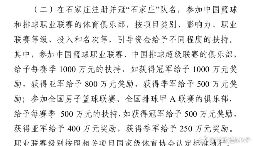 根据《石家庄市体育产业发展引导资金管理办法》显示,参加中甲的俱乐部每赛季给予1000万元扶持,参加NBL联赛的俱乐部每赛季给予500万元扶持。