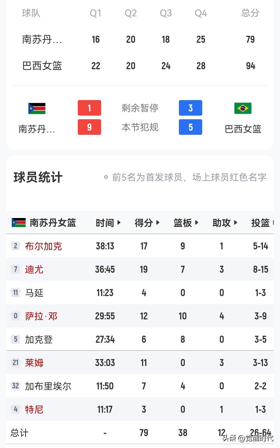 世预赛巴西女篮94-79南苏丹女篮