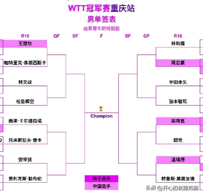 王皓太难了,一轮结束只剩下四个人。 上半区只剩下王楚钦,下半区有周启豪、梁靖崑和温瑞博。 今晚就开始了第二轮,王楚钦VS弗朗西斯卡,王楚钦今天必须做好困难准备,毕竟成都混团输了,昨天弗朗西斯卡采访也充满自信。 周启豪对阵林昀儒胜算不大,梁靖崑晋级应该没问题,温瑞博和小莫不好预测,说不定就能爆冷,新加坡大满贯小莫差点被陈垣宇拿下,看小温第一轮的气势,很期待能晋级下一轮。 比赛越打越难,能晋级的都很强,但愿男单能会师总决赛。 图片来自网络侵权可删。