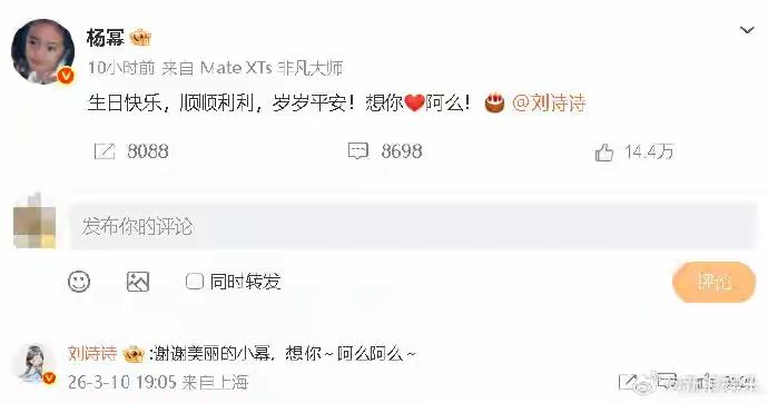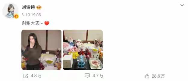 3月10日,刘诗诗迎来39岁生日,她在社交平台分享了两张照片,并配文:“谢谢大家