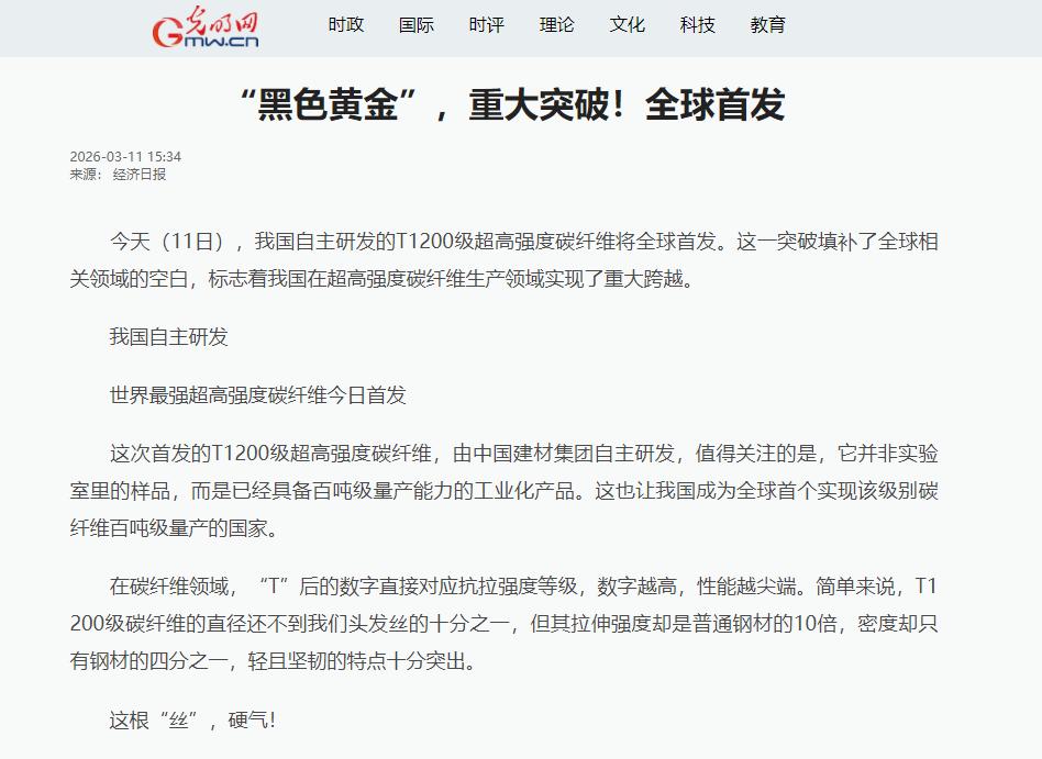 中国太牛了!全球首个量产“黑色黄金”,比钢材结实10倍 3月11日,中国建材集团旗下的中复神鹰,办了件特别长脸的事——自主研发的SYT80(T1200级)超高强度碳纤维正式发布,咱们还是全球首家能大量生产这种材料的企业。 很多人可能不清楚这东西的重要性,今天就用最实在的话,把这事说透,不玩虚的、不绕弯子,保证大家能看懂。 先跟大家说,这个叫“黑色黄金”的碳纤维,不是咱们平时见的普通纤维,是一种黑色的特殊新材料。 叫它“黑色黄金”,不是说它贵得像黄金,而是它性能特别好、用处特别关键,以前只有少数国家能做,咱们想用来,要么花大价钱买,要么人家根本不卖给咱们。 这次发布的碳纤维,有几个关键特点,咱们说实在数据,不瞎比喻。它的单丝特别细,只有几微米,1微米是1毫米的千分之一,比咱们的头发丝细多了,还不到头发丝的十分之一。 它还特别轻,重量只有普通钢材的四分之一,但特别结实,拉伸强度突破了8000兆帕,差不多是普通钢材的10倍。 所谓拉伸强度,就是能承受多大拉力不断裂,数值越高越结实,咱们这材料的强度,比普通钢材强太多。 有人可能会问,这么细、这么轻,真能这么结实?其实它有不同规格,其中一种12K的,一束就有12000根单丝,看着不粗,但承重能力极强,足够支撑起重型设备,这也是它能用到航空航天上的原因。 最关键的就是“量产”,这跟实验室做样品完全不一样。以前像日本这些国家,只能在实验室里做一点点这种碳纤维,没法大量生产,价格贵得离谱,只能当实验室里的稀罕玩意儿,根本用不到实际产业里。 而中复神鹰这次就突破了这个难题,能大量生产,以后这材料就不是奢侈品了,不用再依赖进口,价格也会慢慢降下来,能用到各个行业。 可能有人会问,这东西跟咱们普通人有关系吗?当然有关系,而且关系不小。它能让国产大飞机更轻更安全,航天火箭能搭载更多设备,飞得更远。 平时咱们关心的新能源汽车,用了它能减轻重量,同样的电量能跑更远;老年人用的轮椅、拐杖,用它做会更轻便,还耐用、不容易坏;还有自行车、羽毛球拍这些体育器材,用它做也更轻便结实,以后价格降了,普通人也能用上。 这次突破真的不容易,中复神鹰在这领域钻研了20年,一步步突破了各种技术难题,从原料到设备,全是咱们自己国产的,不用靠国外。 以前高端碳纤维被国外垄断,咱们的产业发展受限制,现在咱们打破了垄断,成了全球领跑者,对国家发展、国家安全都特别重要。 大家别觉得这高科技离咱们远,等它慢慢普及,会实实在在改变咱们的生活,让咱们的汽车续航更长、医疗器械更顺手,还能让国家变得更强大。 这次突破,是无数科研人员努力的结果,也是咱们国家科技越来越强的证明,相信以后还会有更多这样的好消息。